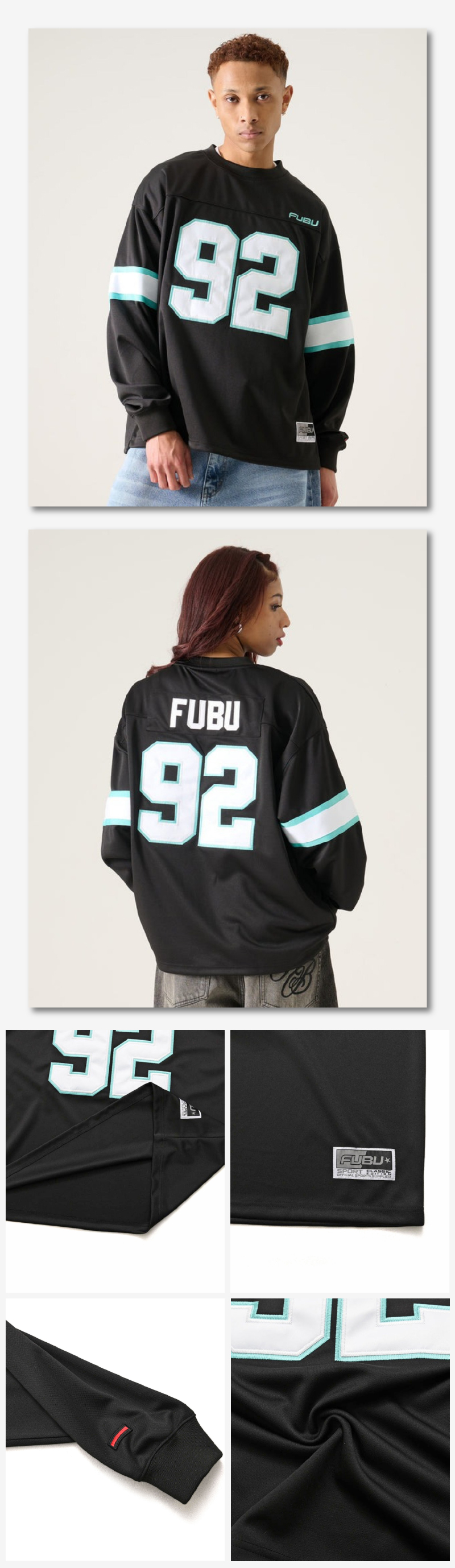 身幅・着丈ともにゆとりのあるビッグシルエットで、レイヤードスタイルにも対応します。フロントとバックに大胆な「92」のナンバリングを配し、その上に「FUBU」ロゴを配置。袖のラインやカラーブロックが、本格的なスポーツテイストを際立たせる一着です。