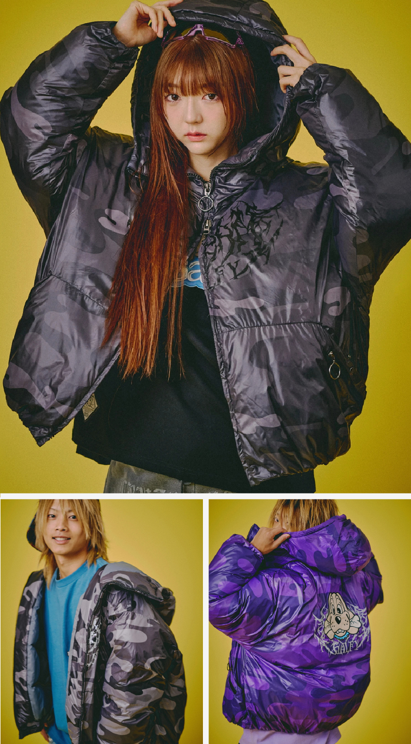 GALFYの新作ダウンジャケット。背面にお馴染みの犬が刺繍され注目間違い無し。細かな機能性にも優れ、アウターもカジュアルコーデ使用にしたい方にオススメの1着。顔も隠せるし、ポケットも多いしなんか使えそう。ついでにあったかいし。 |
