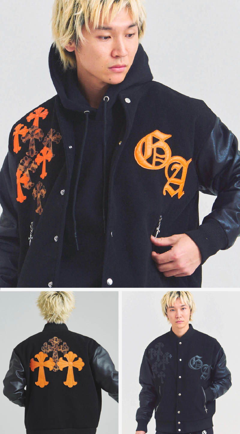 クラシックなスタジャンデザインをベースに、モダンな“クロスモチーフ”刺繍を前後に配した存在感のある1枚。 中綿入りで軽く暖かく、秋冬のデイリースタイルに最適です。ブラックはシックに、オレンジは遊び心を添えるカラーアクセント。 肩・袖の切り替えが立体感を演出し、コーディネートの主役として映えます。 |
