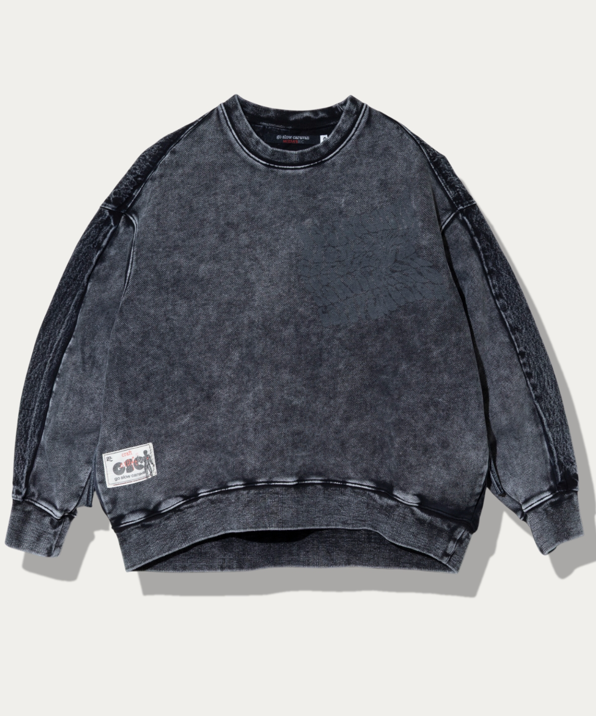 柔らかなやや厚みのある裏毛をメイン素材に肩や袖部分をデニム素材で切り替えたクルーネックプルオーバー。立体的なパターンが組まれており、バックのデニムとの素材切替部分にはギャザー入り。ワイドな身幅に対して着丈はやや短めに設定しているため、着用時に丸みをおびた立体感の際立つ仕様。USED感の強い製品染加工で雰囲気の良い仕上がり。