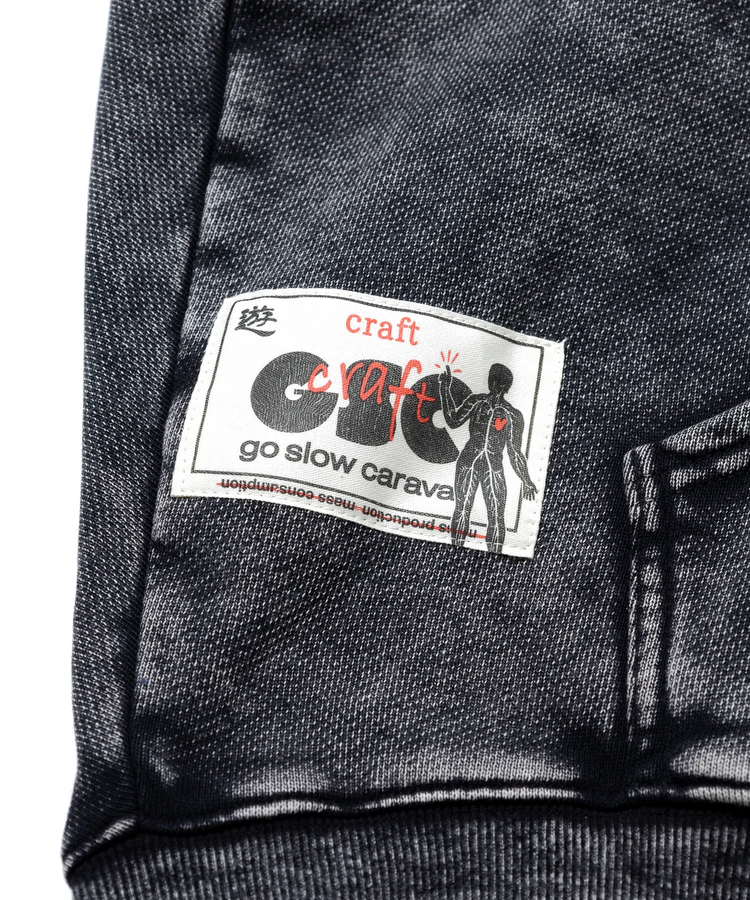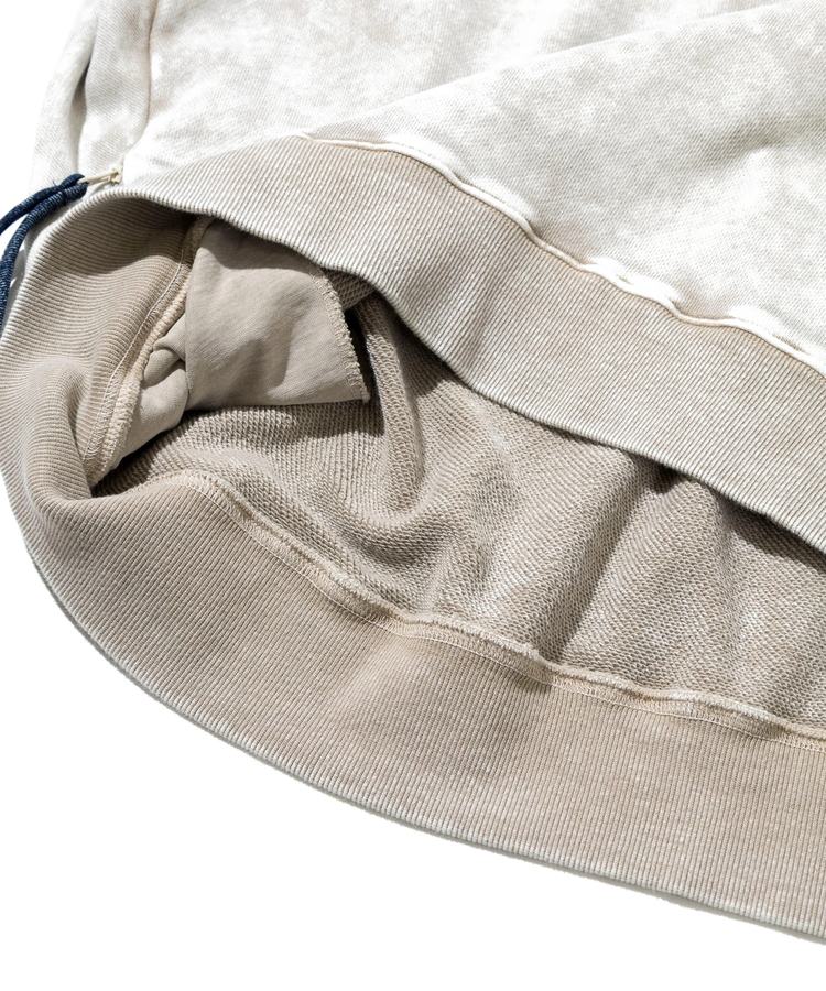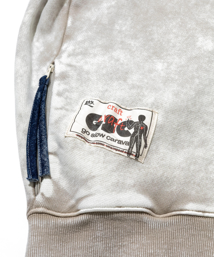 柔らかなやや厚みのある裏毛のスウェット生地をメイン素材に、デニム素材で切り替えたクルーネックプルオーバーとZIPパーカ。USED感の強い製品染加工により雰囲気の良い仕上がりに。