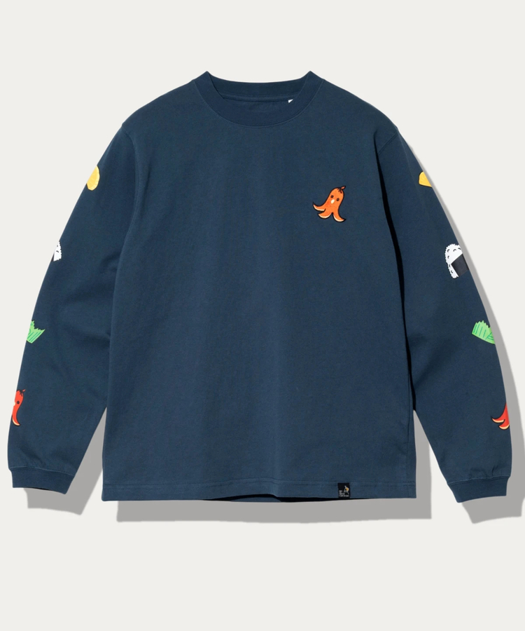 胸にはタコさんウインナー。袖にはお弁当の素材たちをライン上にプリント。ハットでも登場した「お弁当柄」がベーシックシルエットのロンTで登場。