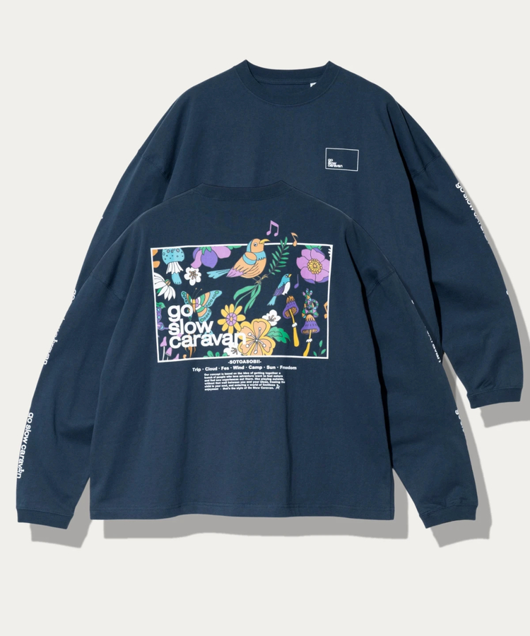 ワイドパンツやスカートなどとも合わせやすい着丈、身幅のゆったりシルエット。背中にゴースローキャラバンのイメージグラフィックとコンセプト、袖にはgo slow caravanをラインプリントした集めたくなる定番シリーズアイテム。