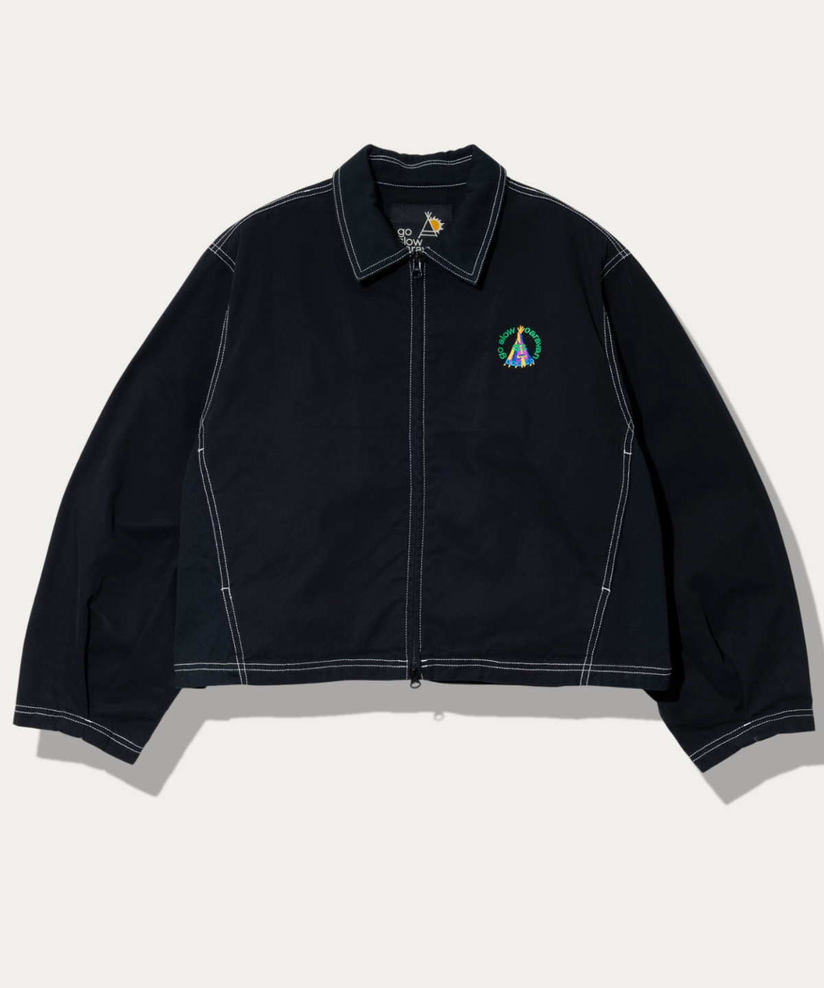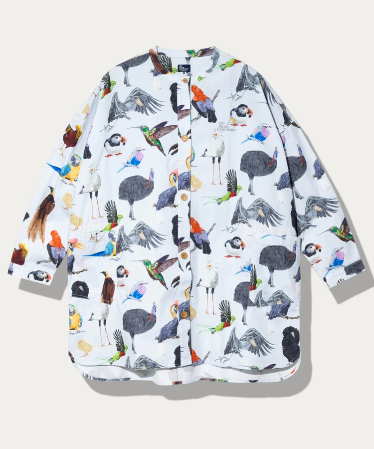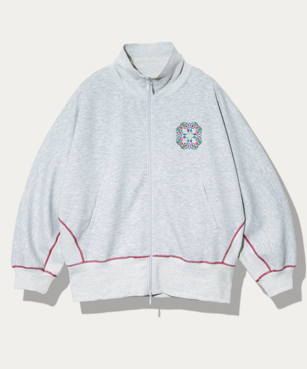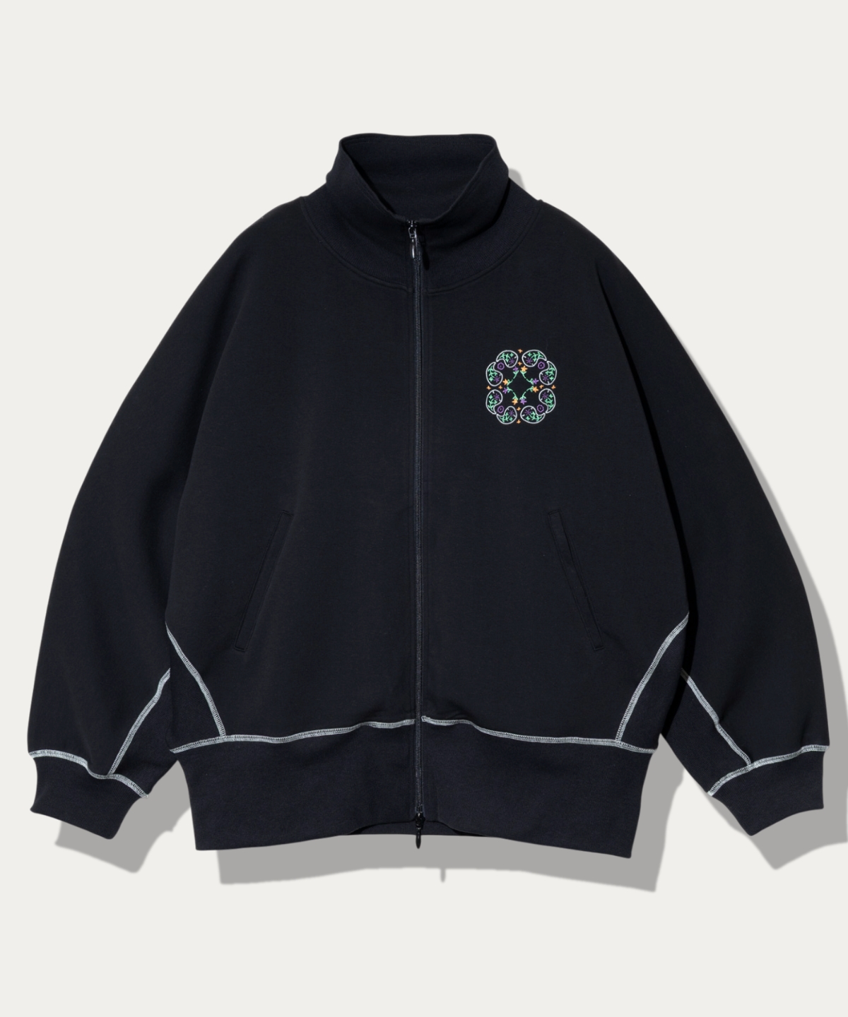 軽アウター感覚で着用可能なゆったりとしたサイズ感。ドルマンスリーブに胸のペイズリー刺繍と配色のステッチがアクセントに。スカートとセットアップも可能。