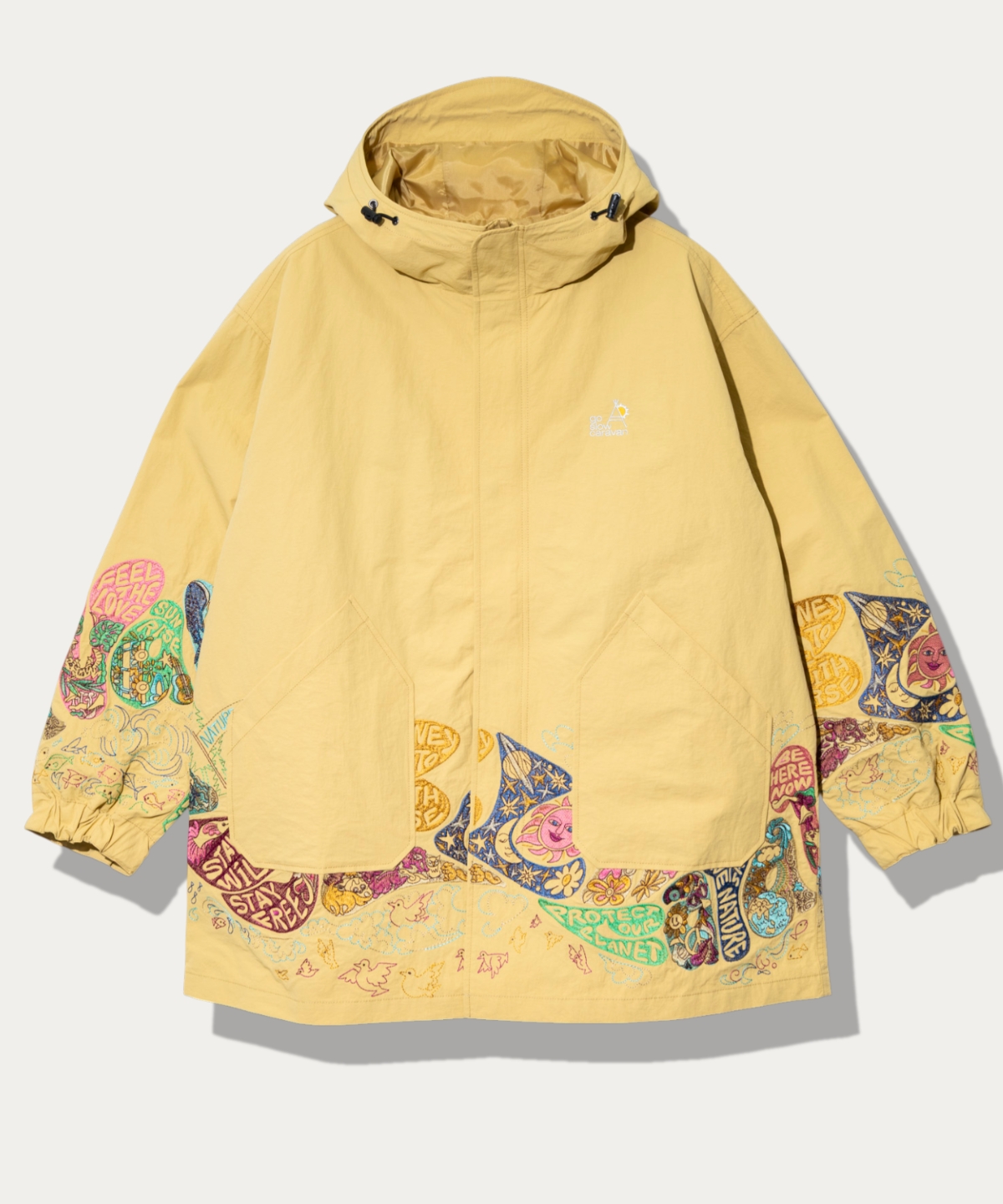 軽量で耐久性に優れたウェザークロスを使用したフィールドコート。袖、裾回りには大胆に刺繍を施した大迫力が存在感を放つ。裾の裏側には内ポケットも備え収納力アップ。