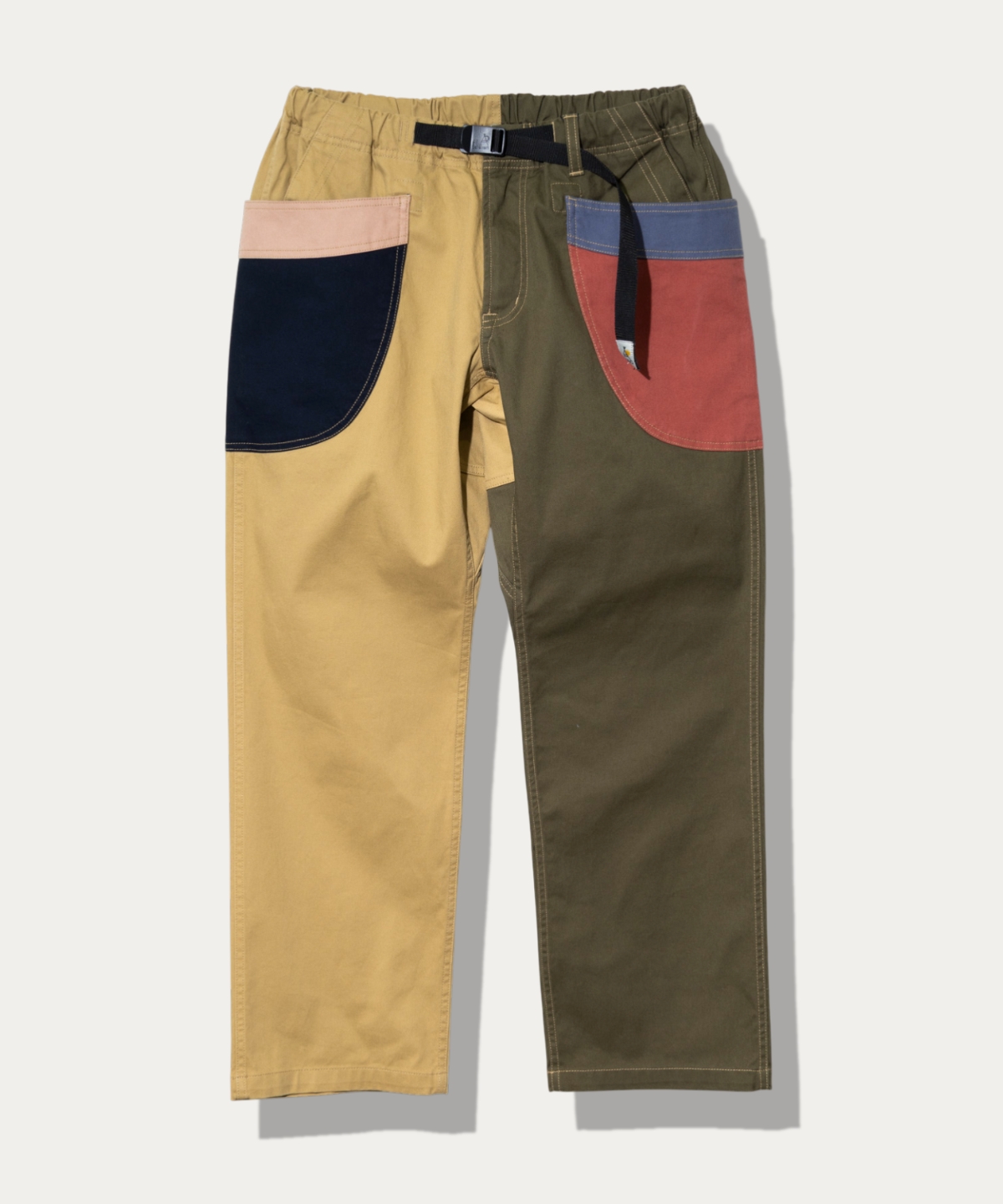 6色のストレッチオックス生地をクレイジー配色。膝から裾にかけて緩やかなテーパードシルエットが特徴的