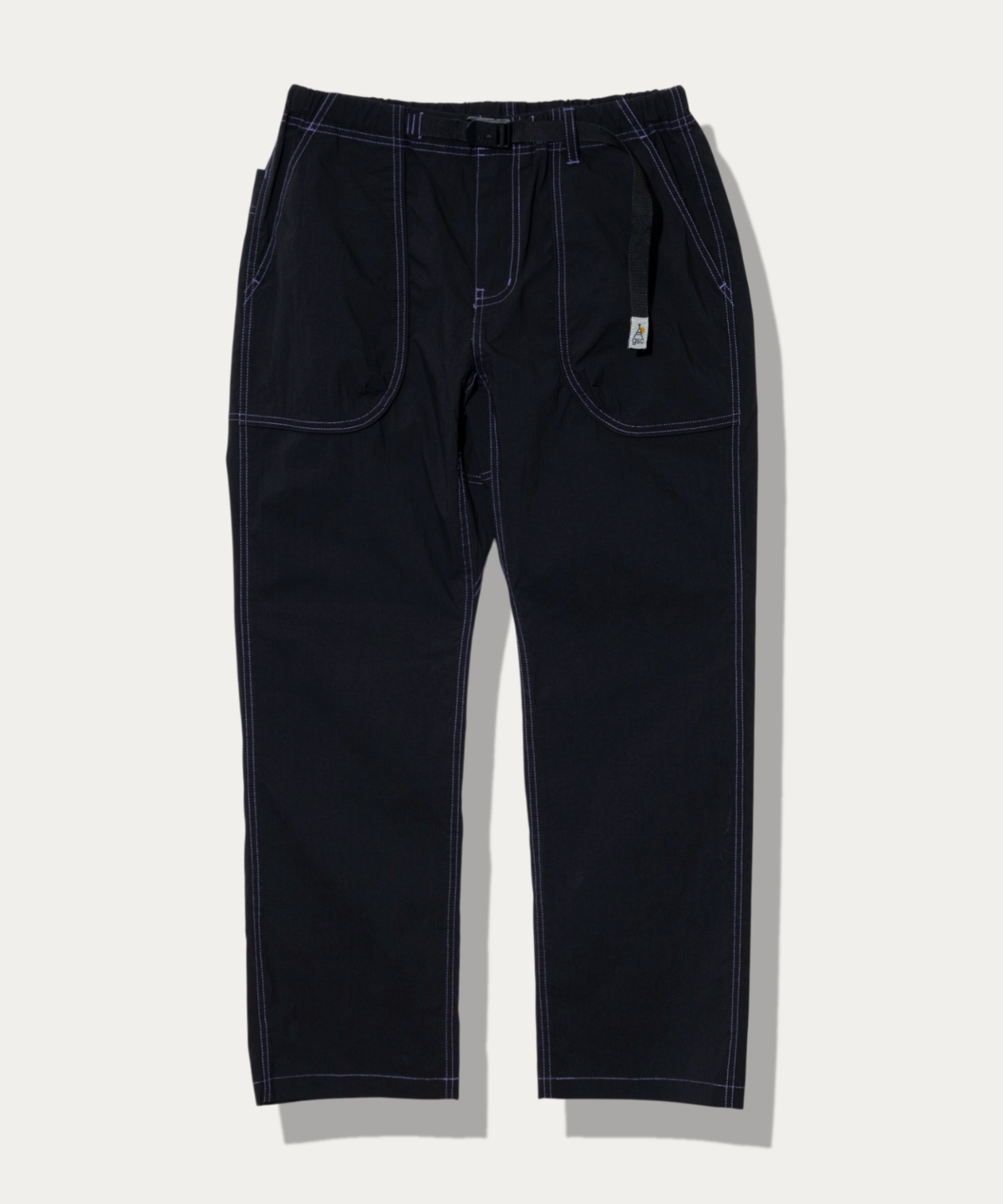マットなナイロン/コットン生地を使用したベイカーパンツ。シンプルなデザインながらストレッチ、ガゼット、ウェービングベルト、カラーステッチなどギミックが詰まったユーティリティーなパンツ。