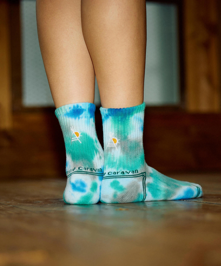 存在感のあるタイダイ染めに、ゴースローキャラバンのヤグラロゴをジャガードで表現。1点ごとに異なる色合いが楽しめるタイダイならではの風合いが魅力です。履き口は配色切り替えのレイヤード風デザインで、2枚重ねて履いているような見た目を楽しめるのもポイント。スタイリングの主役になるアイテムです。