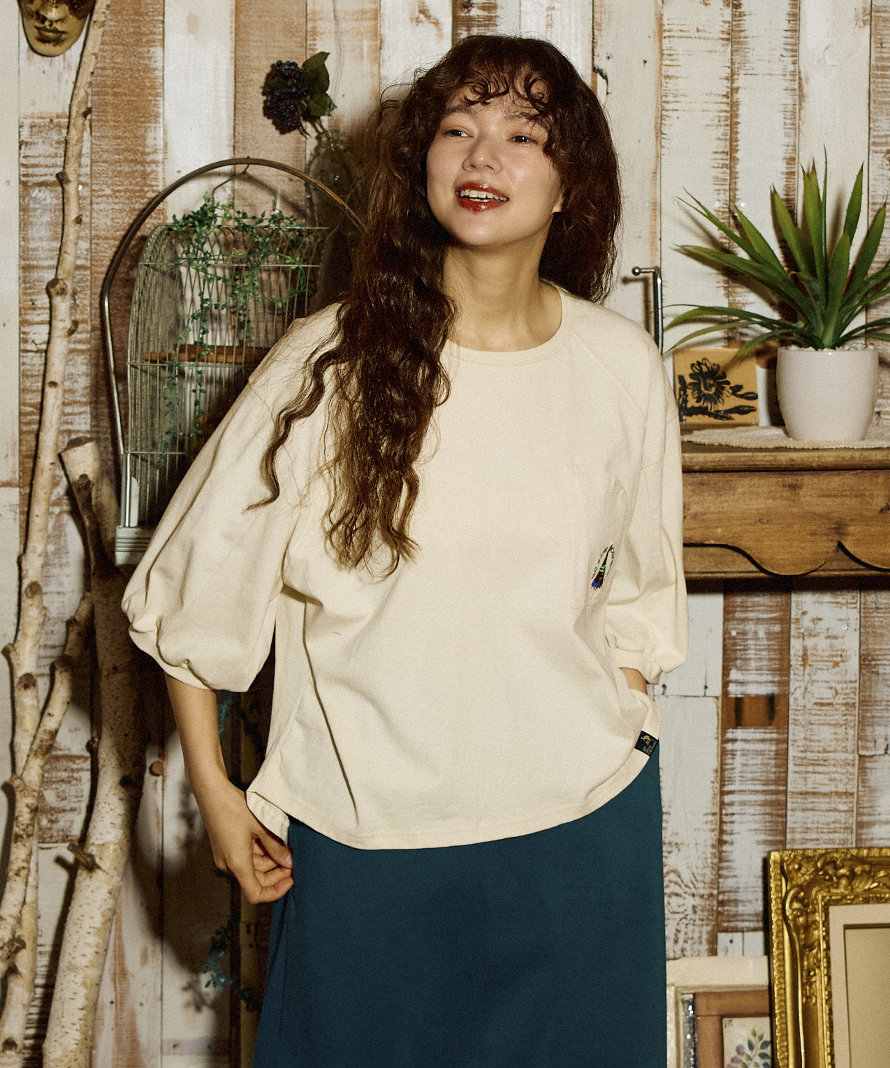 セットインでもありラグランスリーブでもあるタポッとしたバルーンスリーブがポイントのプルオーバーTEE。