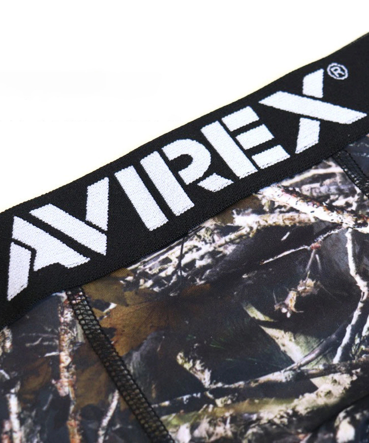 リアルツリーカモの総柄デザインを採用した、存在感のあるボクサーショーツ。ウエストゴム部分にはAVIREXロゴをあしらい、ブランドらしいアクセントをプラス。