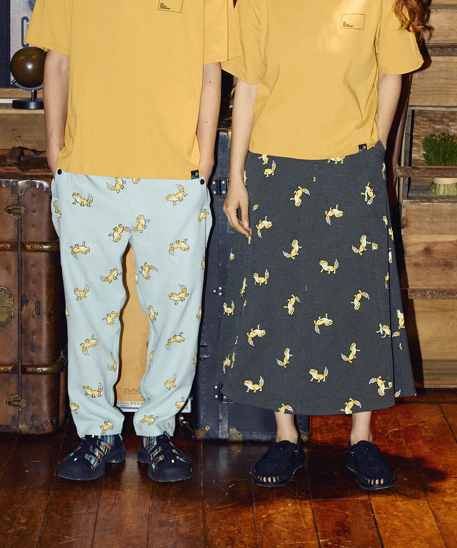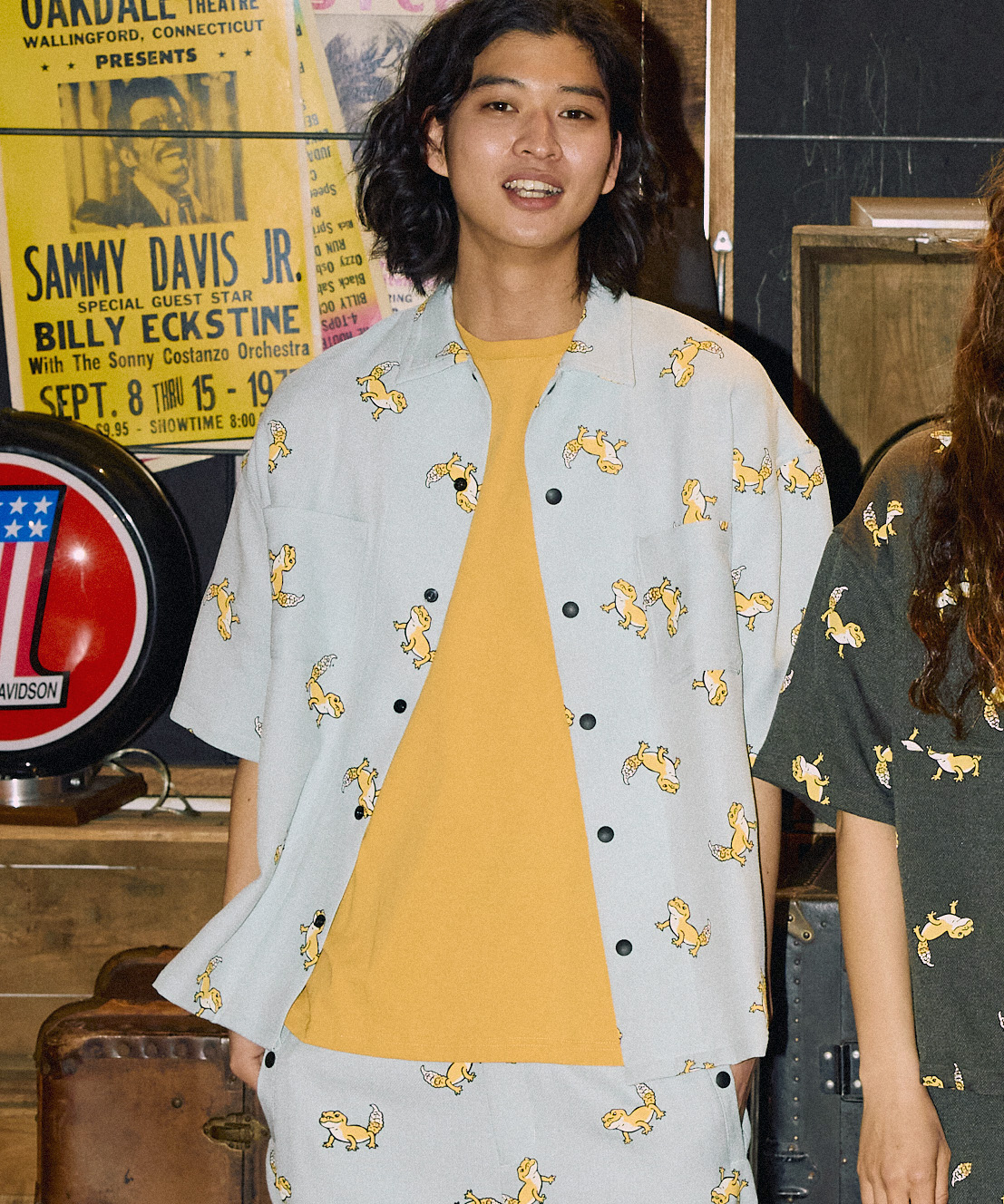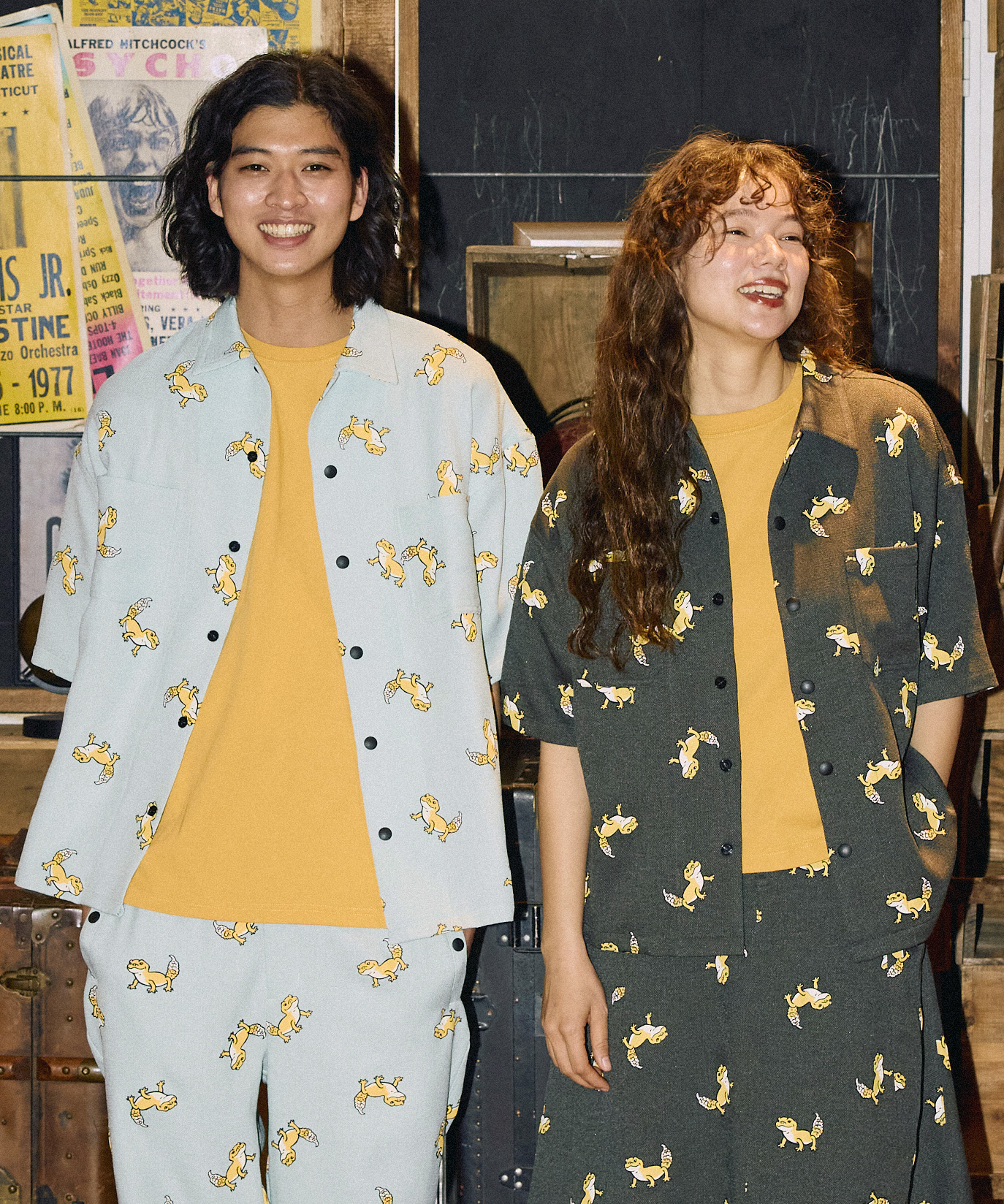 麻のような表情に仕上げたオリジナルのポリエステル生地は、ざっくりとした風合いと優れた通気性が特徴で、暑い季節でも快適に着用できます。モチーフには、遊び心のあるレオパードゲッコーを総柄でプリント。シンプルになりがちな夏のスタイリングに、さりげない個性をプラスしてくれます。