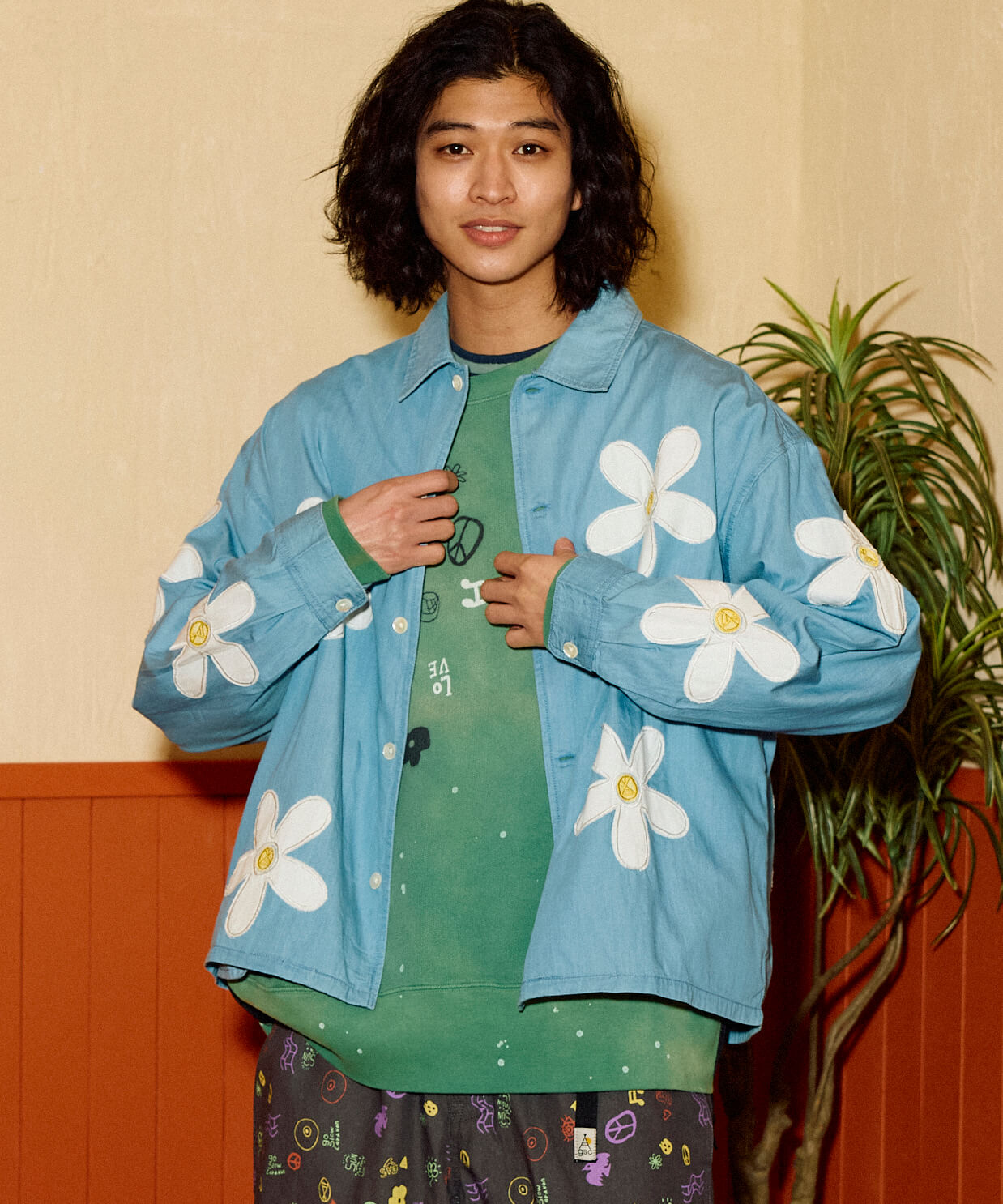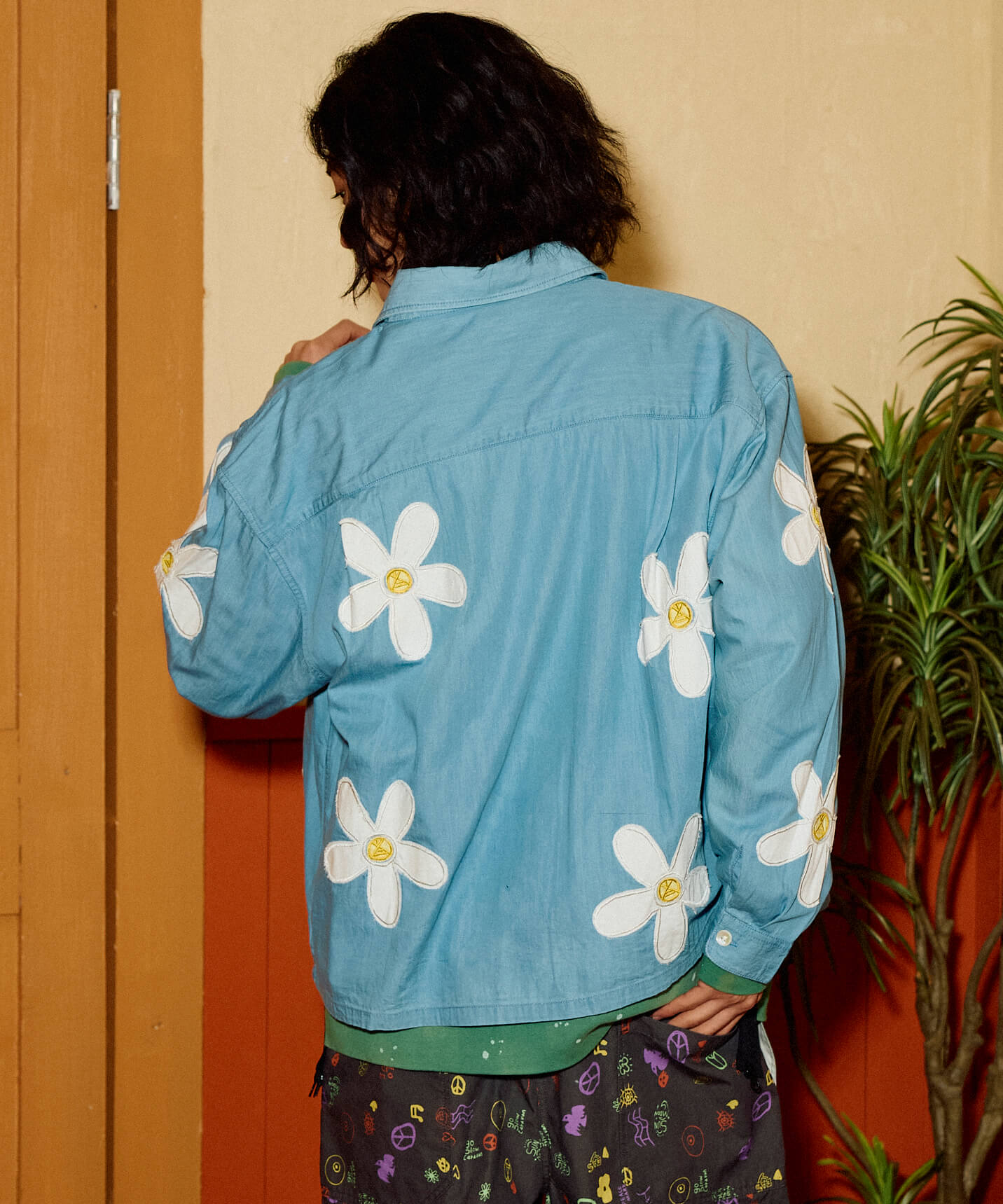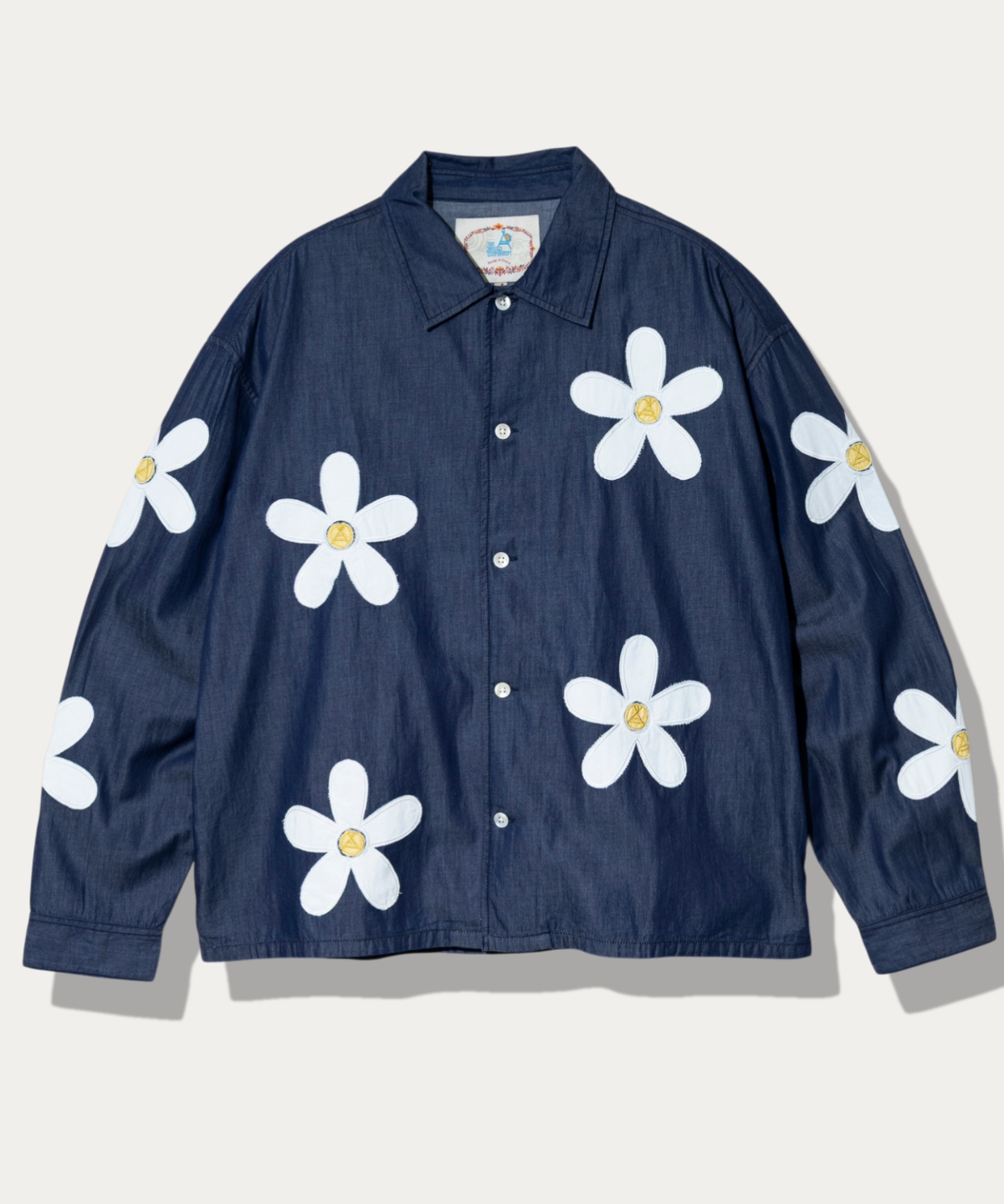 インド独特の薄手でしなやかなデニムに大きな花柄のカットワーク刺繍を施したユニセックスなシャツジャケット。
