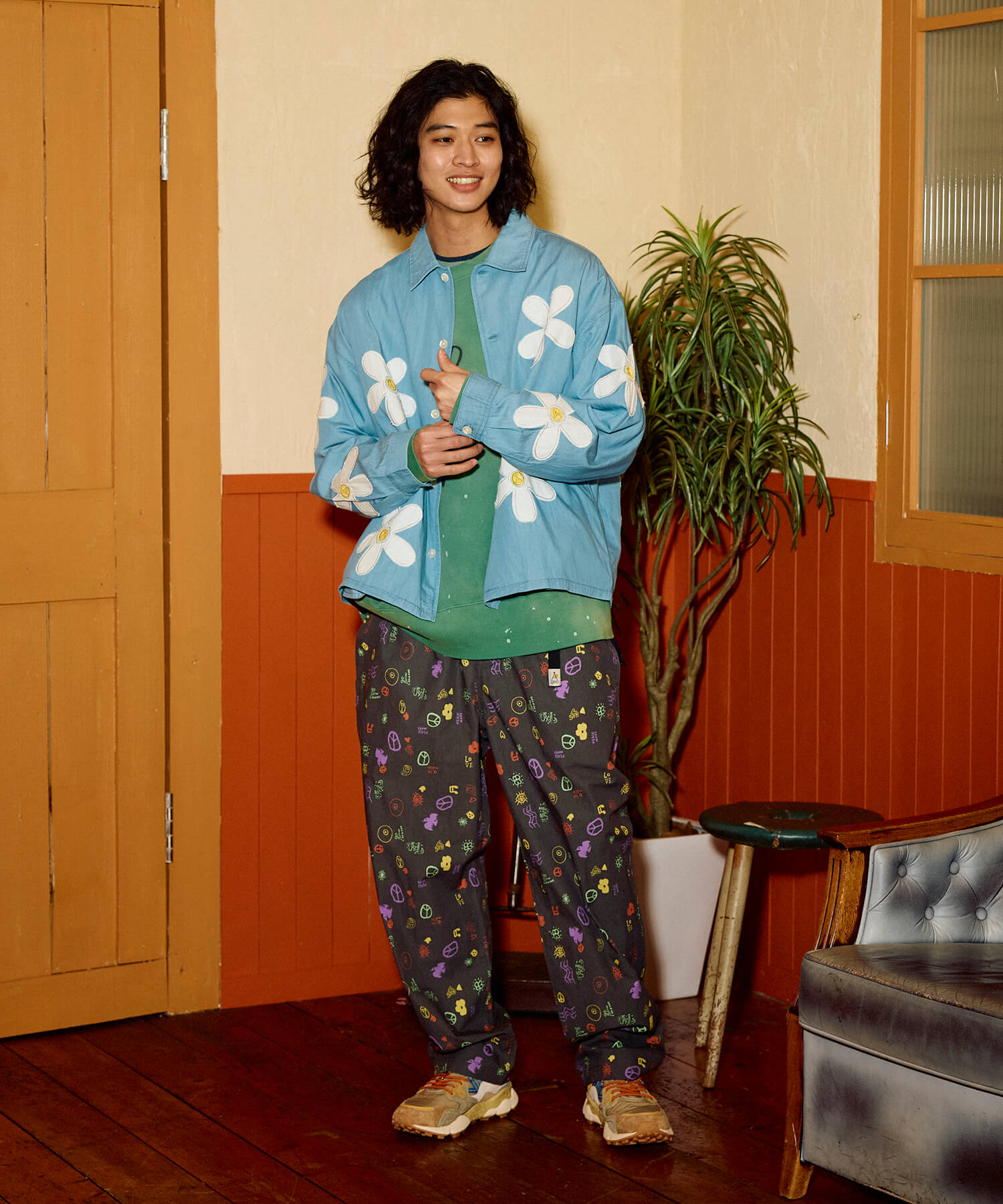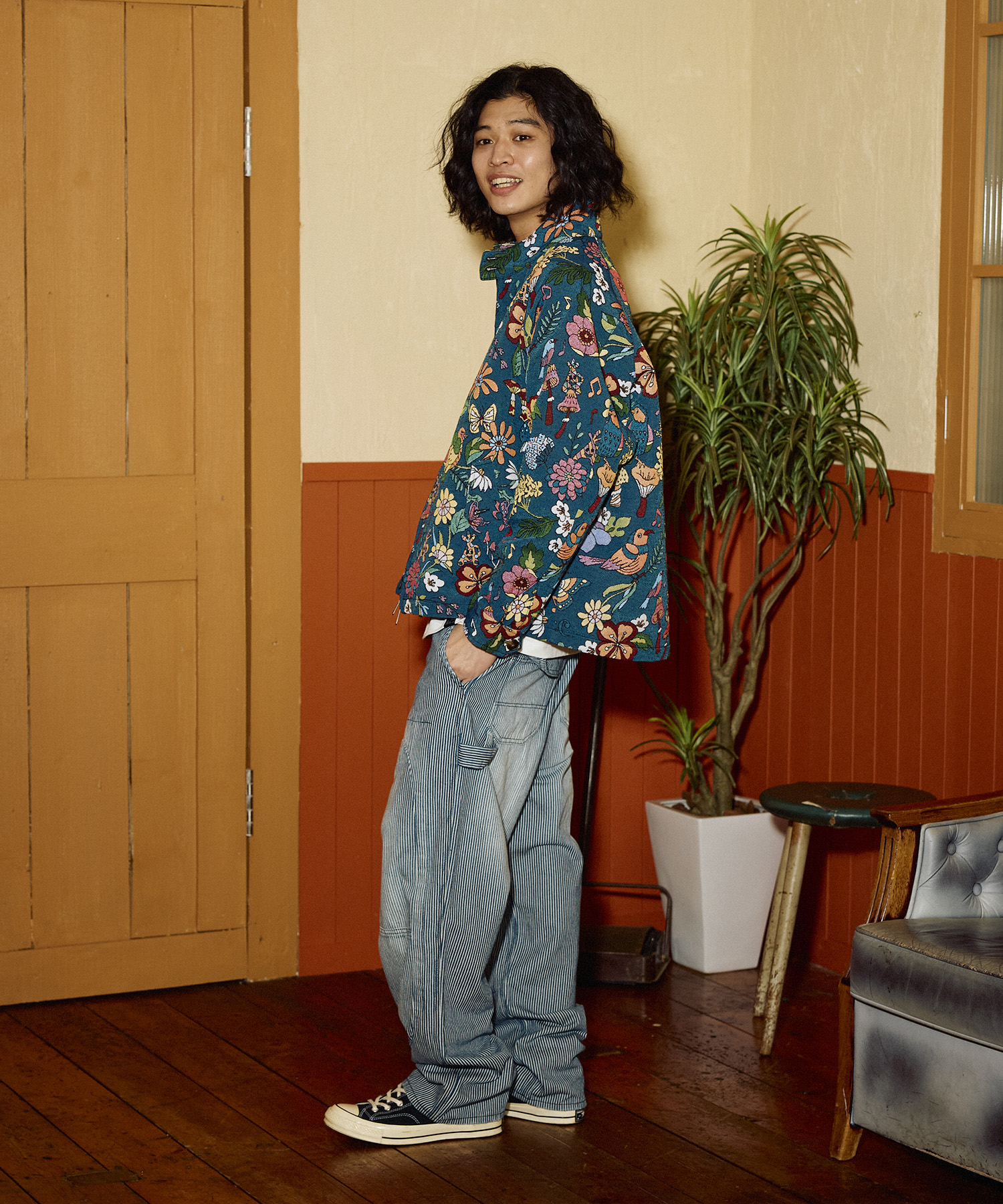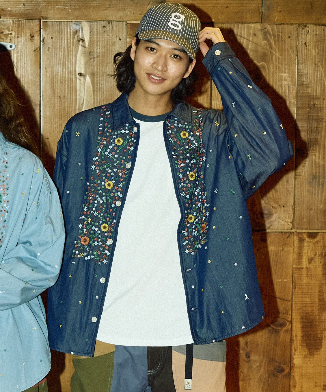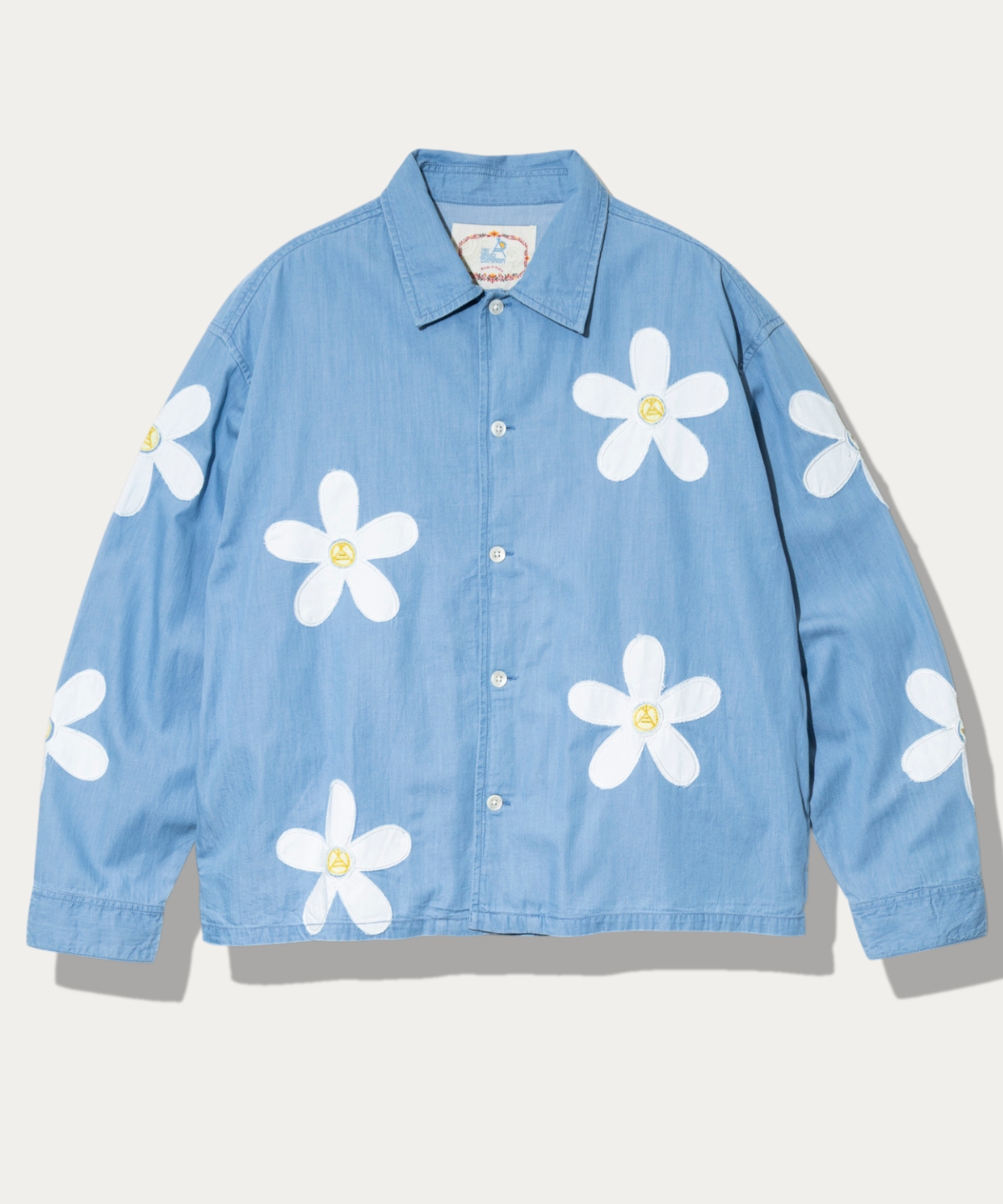インド独特の薄手でしなやかなデニムに春らしい小花柄を刺繍で散りばめたシャツジャケット。花柄の中にヤグラロゴも隠れています。大きめのリアルシェルボタンも印象的。裾はラウンド仕様で脇にはポケットも配置。