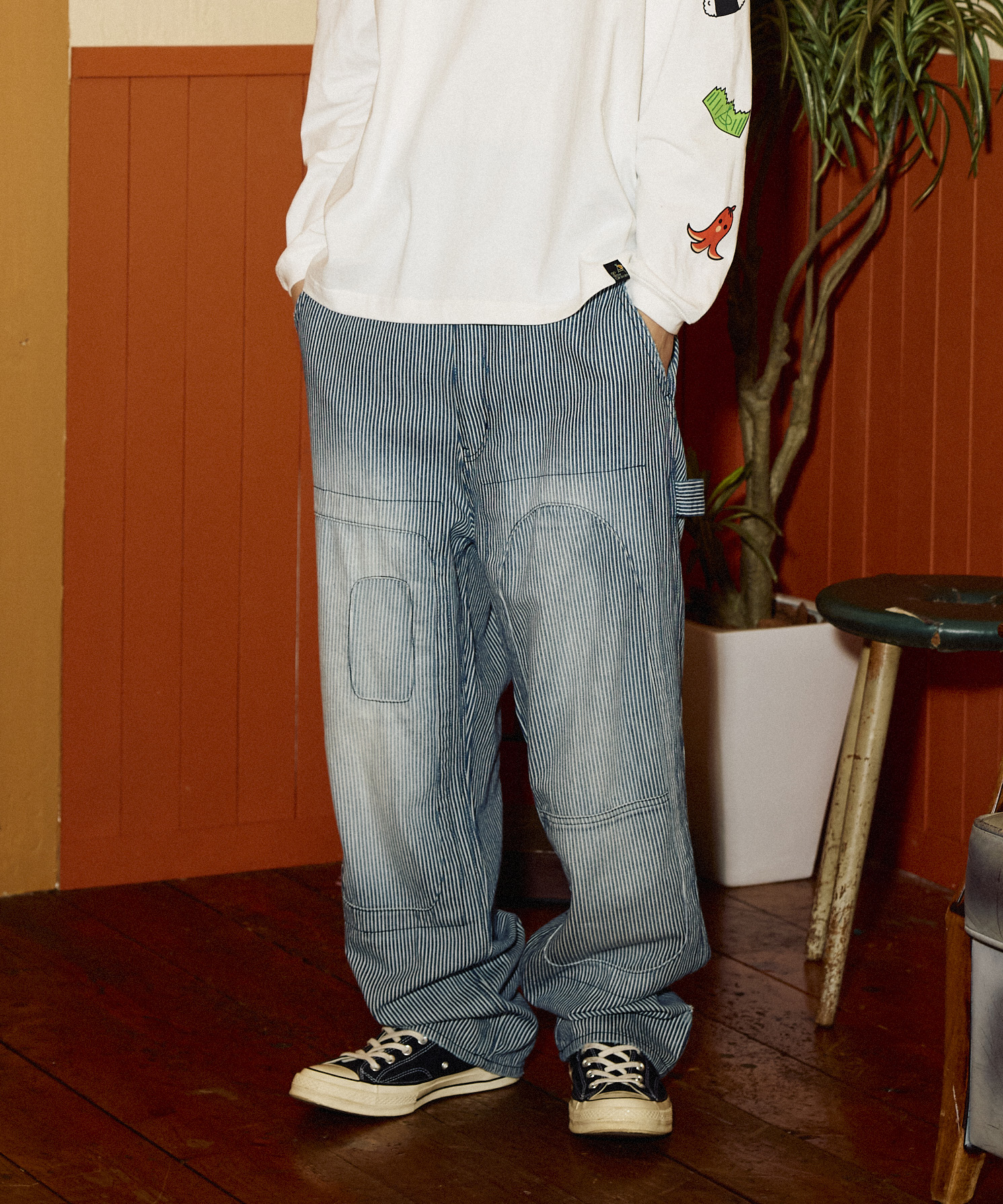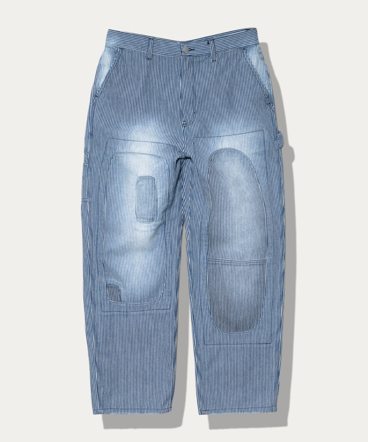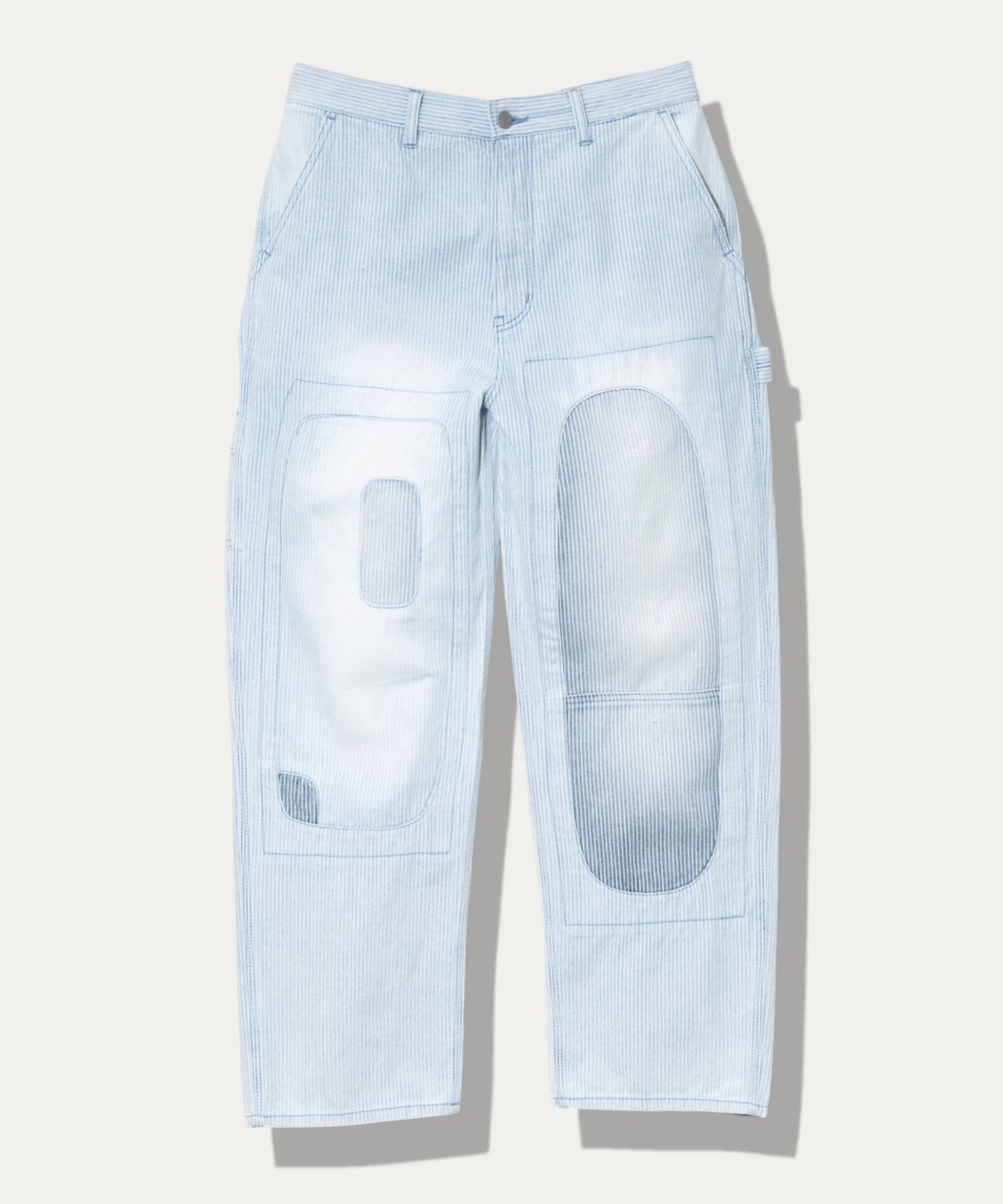 ライトオンスのヒッコリー生地を使用したゆったりしたストレートシルエットのペインターパンツ。長年着古したようなリメイク加工を施しました。