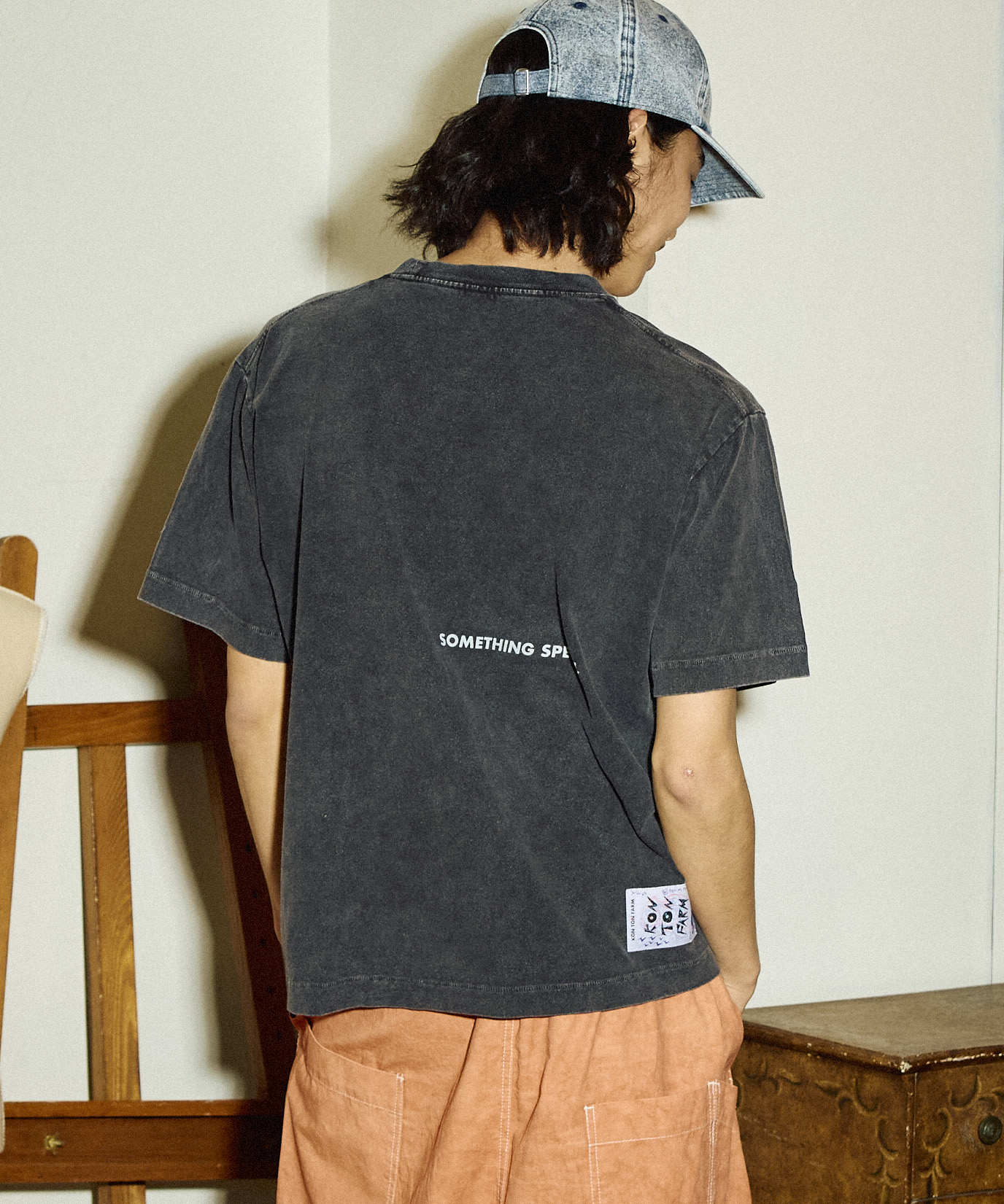 製品染め加工を施したTシャツに、サイケデリックなトーストを首のリブまで跨ってプリント。レーヨンとコットン