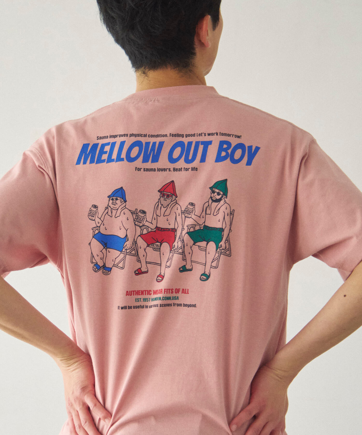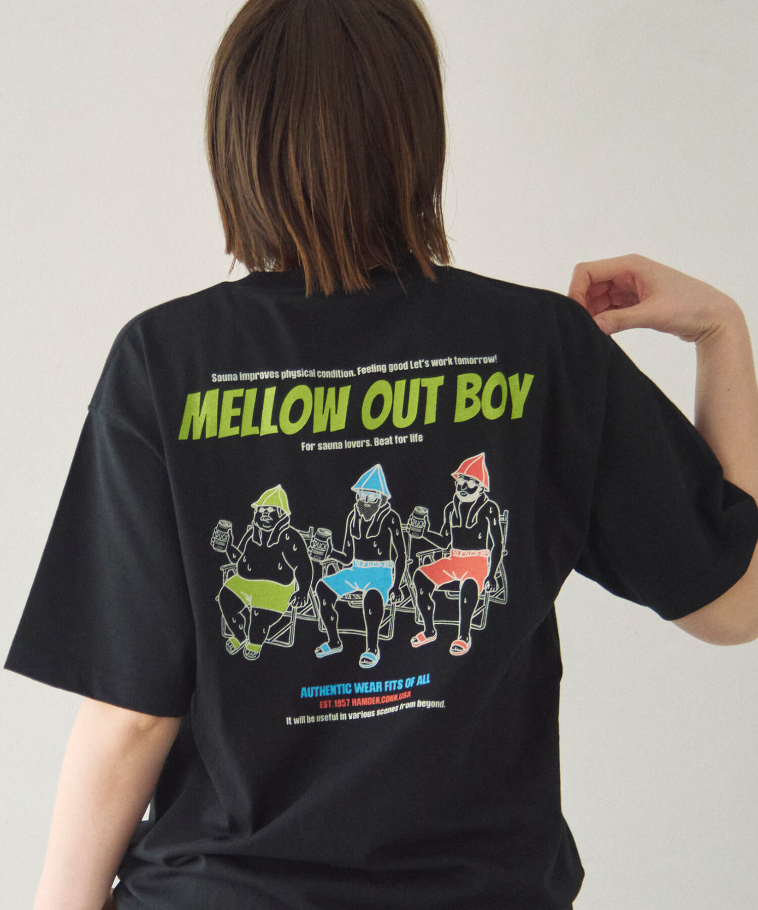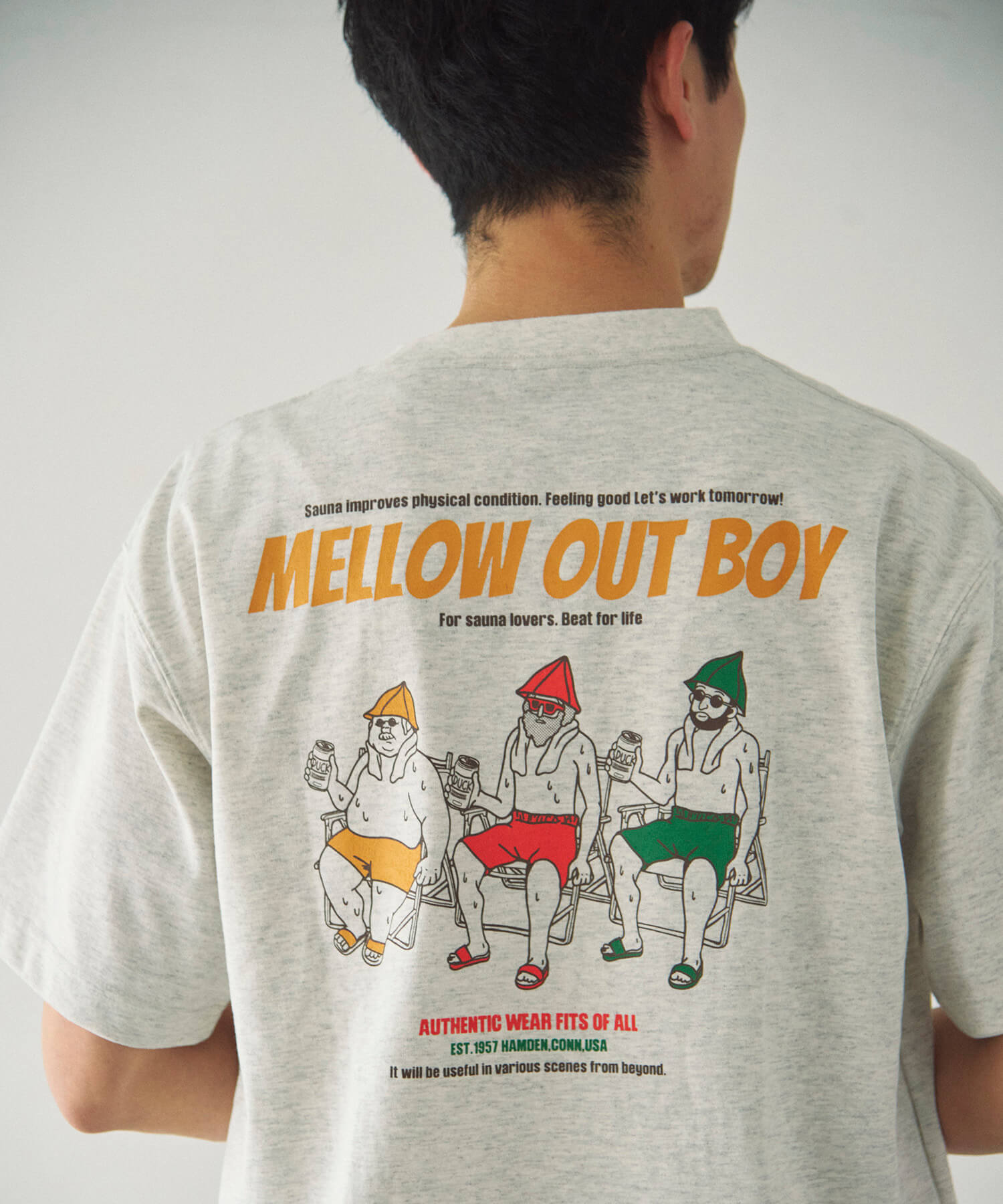 サウナ〜水風呂で“整う”3人のOJIさんを描いた、ユーモアたっぷりのグラフィックTEE☆思わずクスッとするポップなイラストと、「MELLOW OUT BOY(整う・落ち着く)」のメッセージが絶妙にマッチした一枚です。