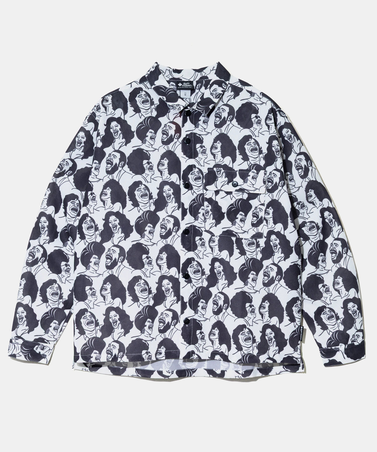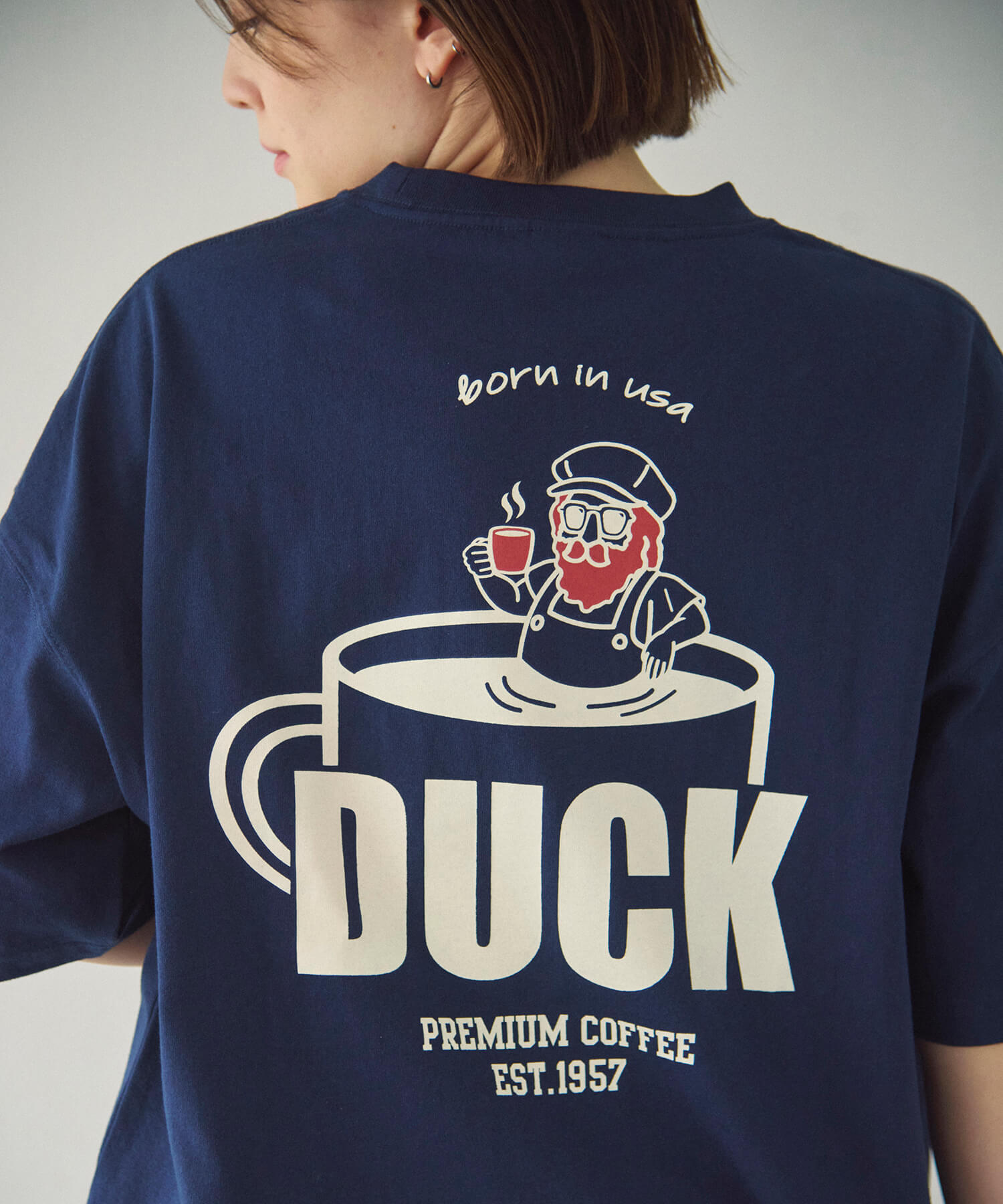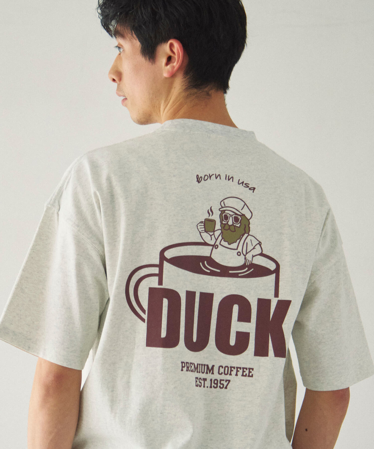 架空のコーヒーショップのユニフォームTシャツをイメージした、遊び心たっぷりのグラフィックT☆マグカップに浸かってコーヒーを愉しむ“OJISAN”のキャッチーなイラストが、思わず目を惹くデザイン。スポーツ会場やイベントでも定番となった“コーヒーのキッチンカー”をモチーフに、レトロなムードを感じる一枚に仕上げました。