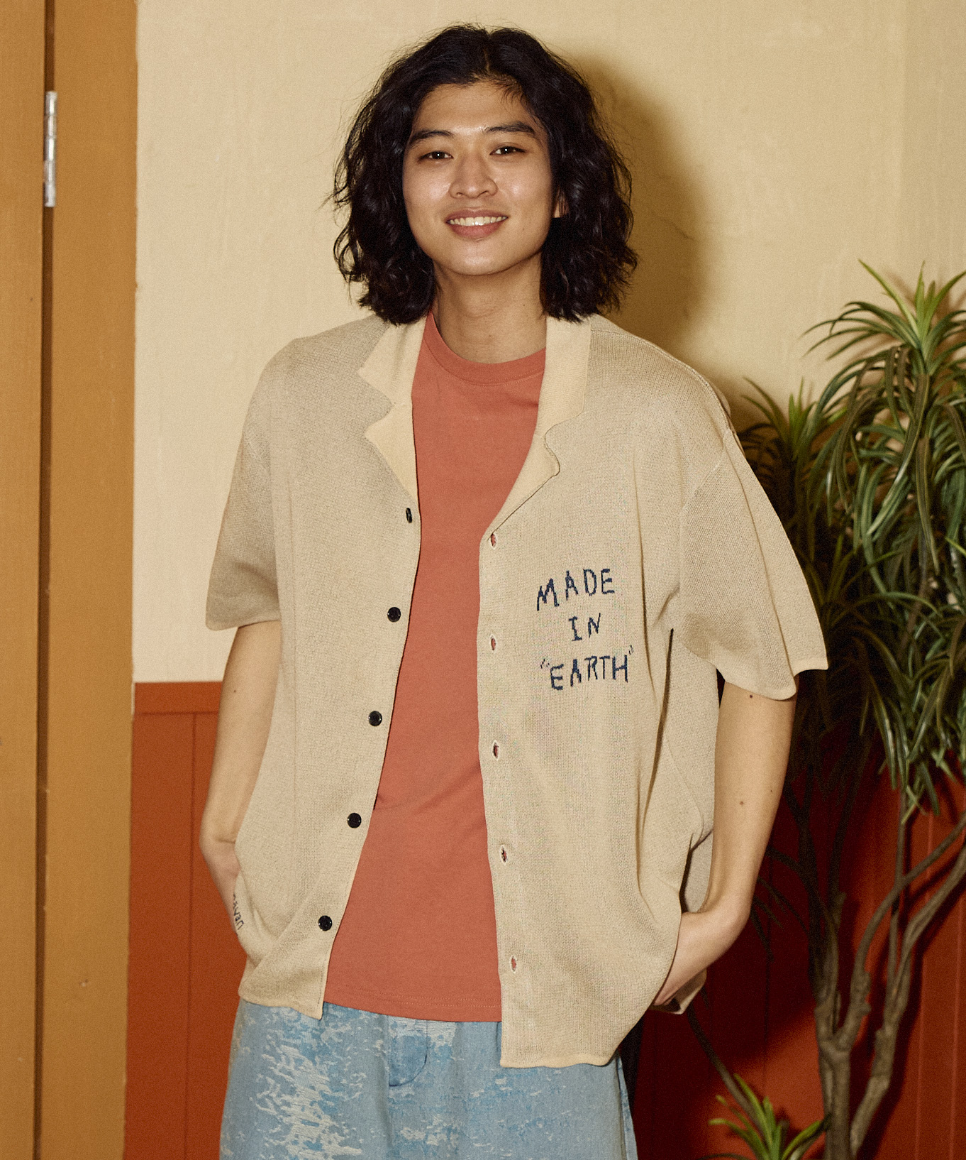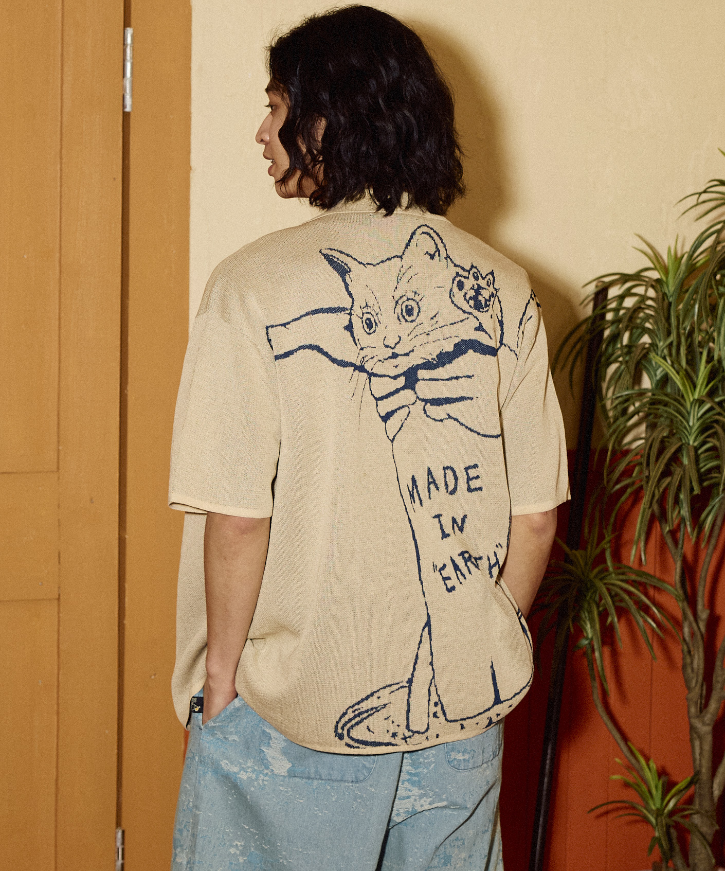 ドライタッチなゆったりとしたサイジングのサマーニットが登場!ジャガード編みによる地球から連れてこられた猫。オープンカラーでさらりと羽織れる1枚です☆