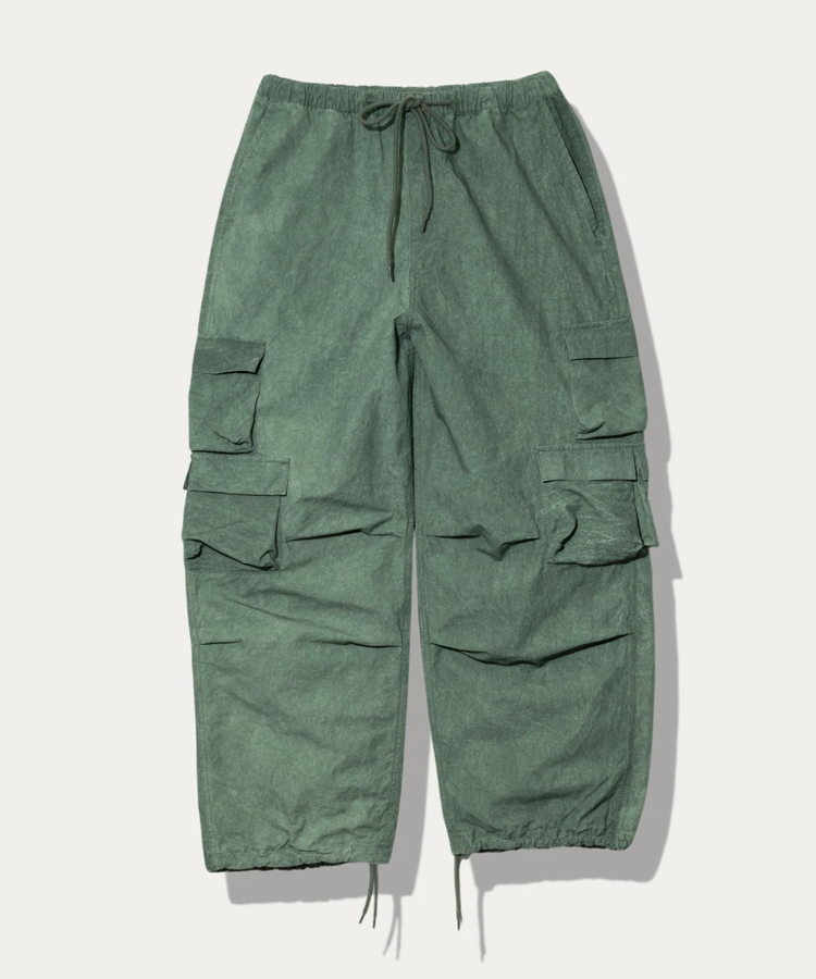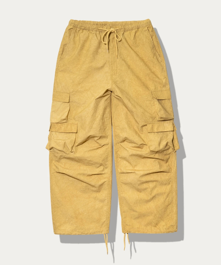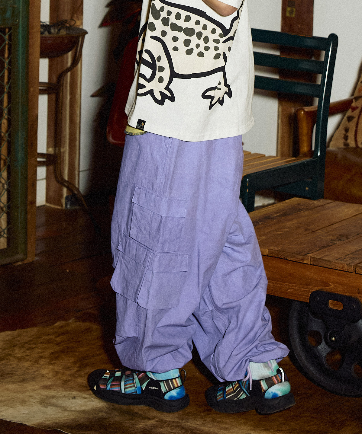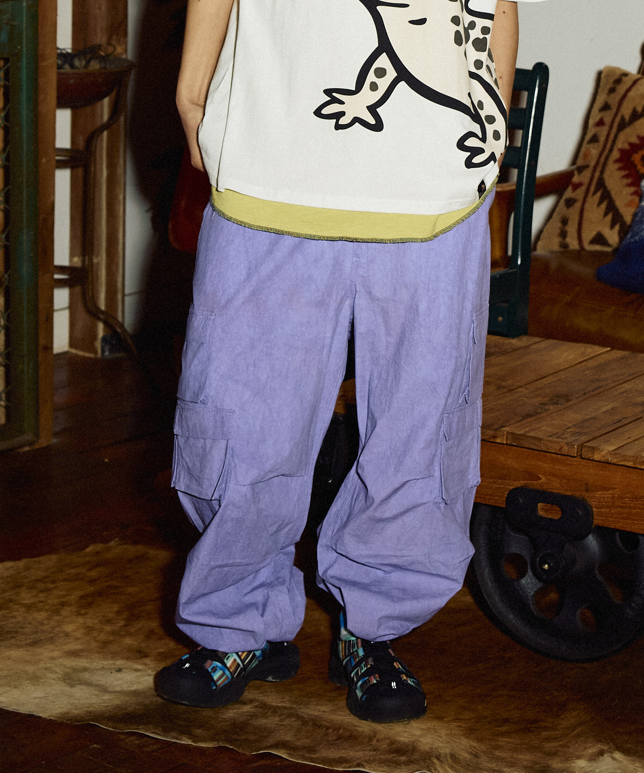 張りとしなやかさを備えた高密度のダンプ生地を氷と染料を使い、溶ける過程で自然な濃淡や滲みを表現したICE DYEのーゴパンツ。左右に3つずつの計6つのカーゴポケットを備え全体的に太めのルーズシルエット。裾にはスピンドルも通してあるのでシルエット調整が可能。