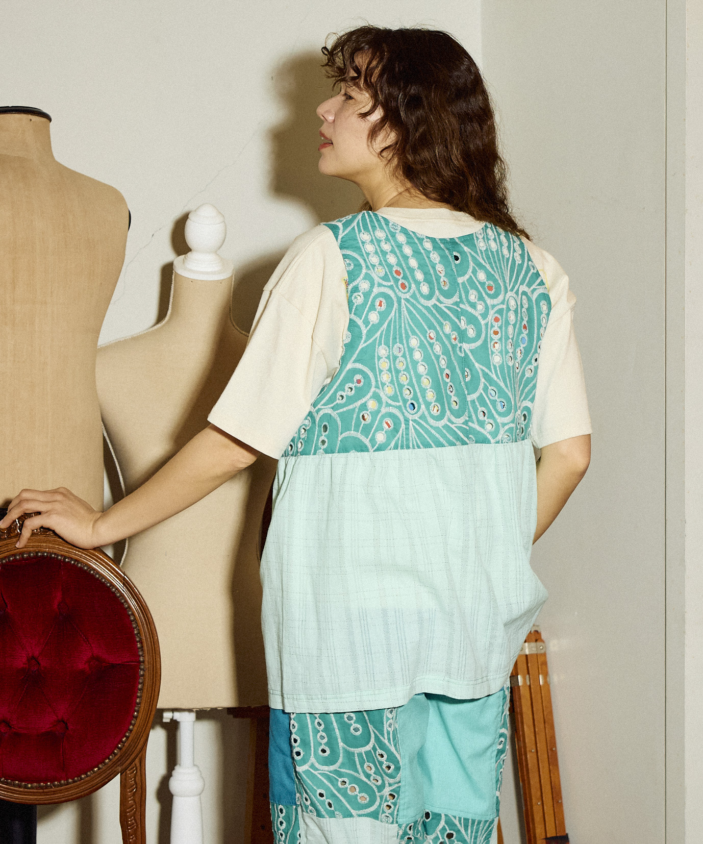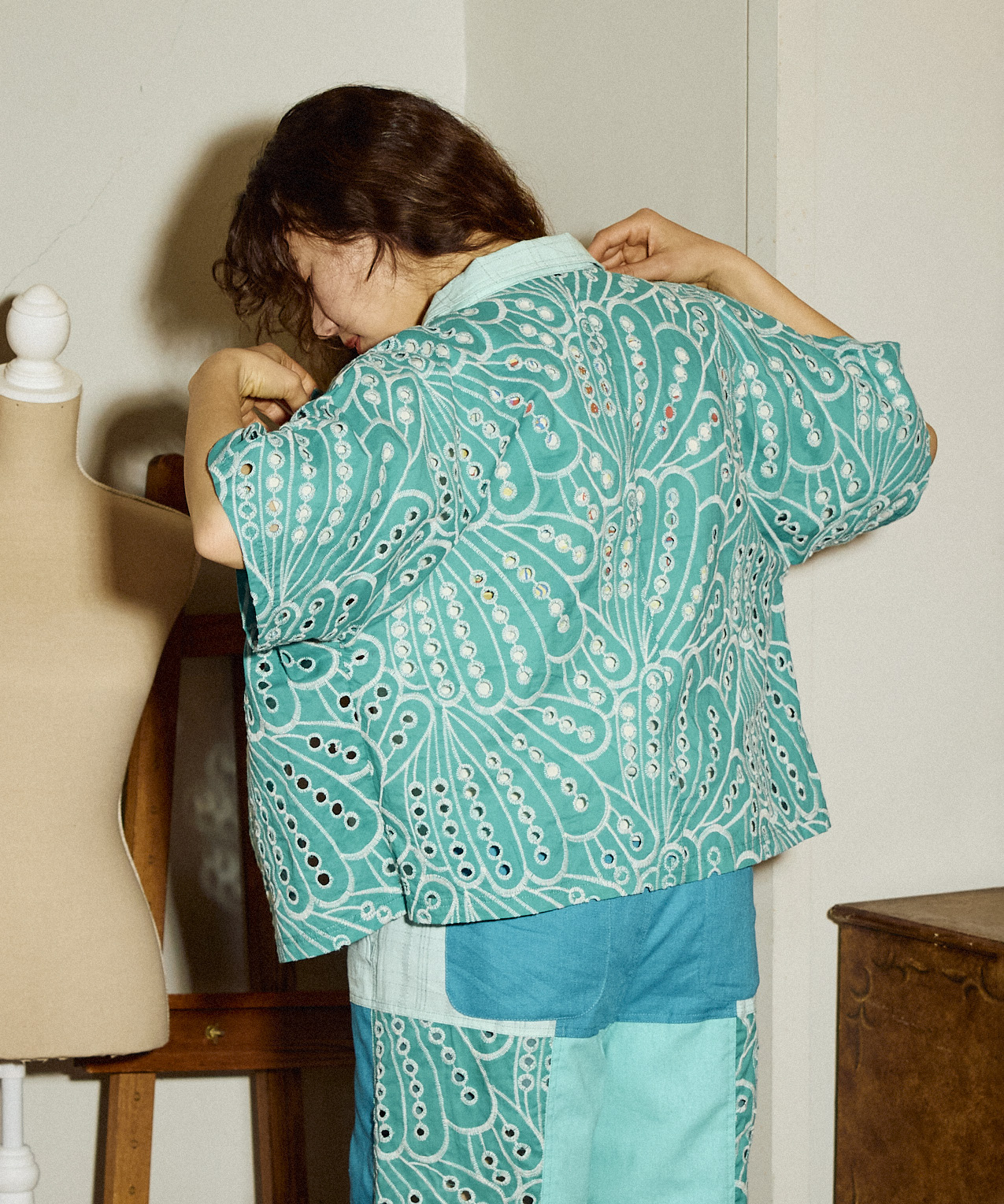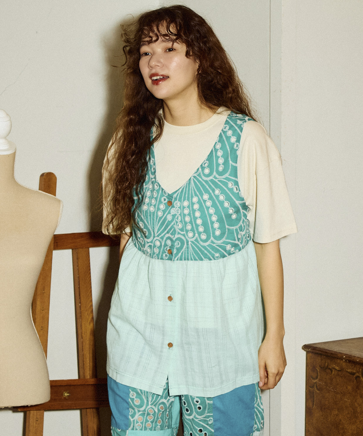 Tシャツやワンピースに重ねるだけで、ベスト感覚でレイヤードが楽しめる一枚。繊細な柄と涼しげな素材感が、シンプルなコーディネートに程よいアクセントをプラス。シリーズの中でも着こなしの幅を広げてくれるアイテムです。