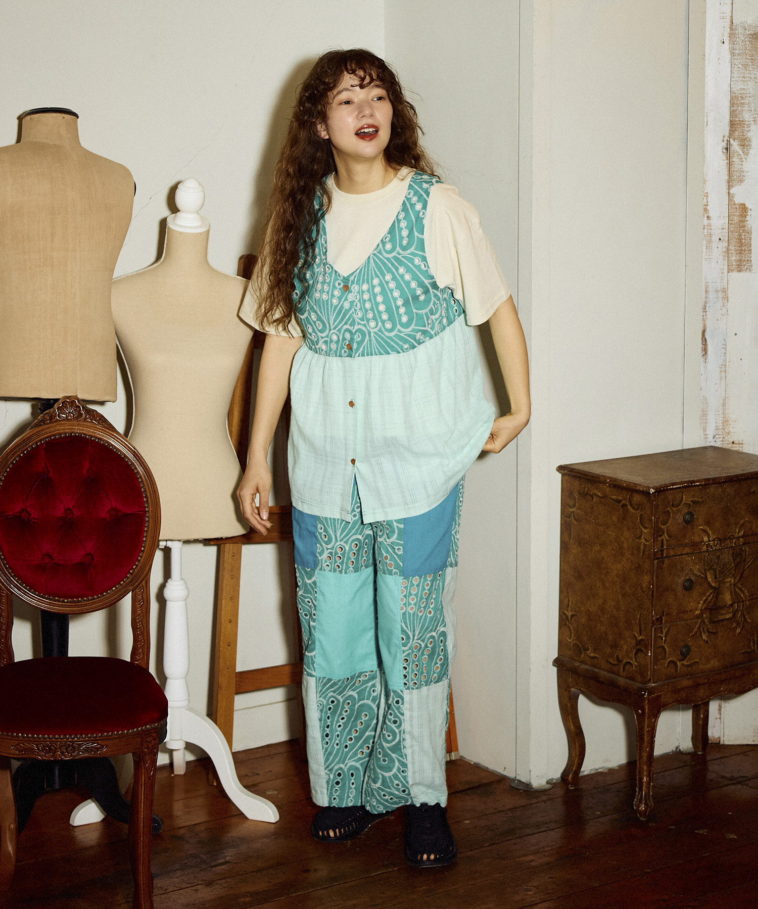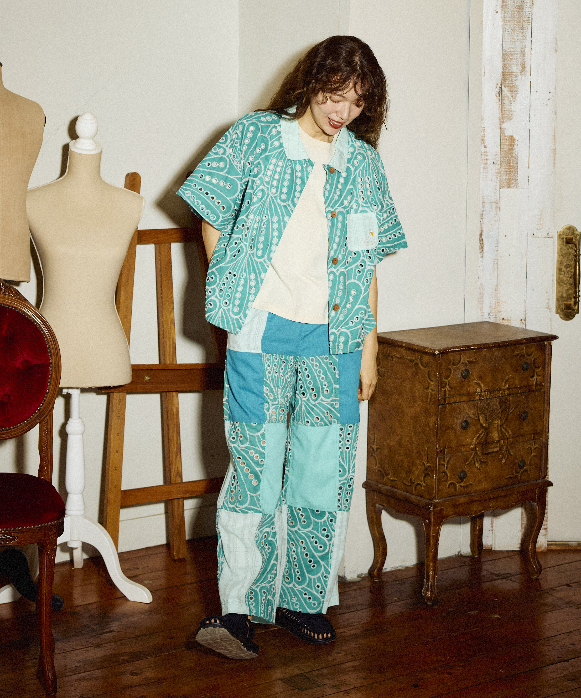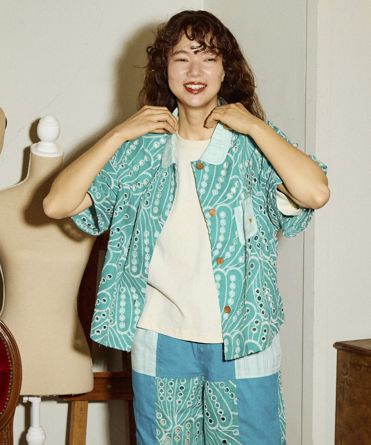 見た目も体感も風通しがよく涼しいカットワーク生地を使ったシリーズ。Tシャツにベスト感覚で使えるノースリーブブラウス、真夏も快適にタンクトップなどにもさらっと羽織れるショートスリーブシャツ、4種類の生地をパッチワーク切替にさらっとした履き心地のボトムにはライナー付き。是非ご覧ください♪