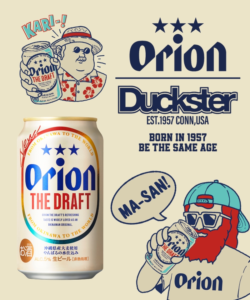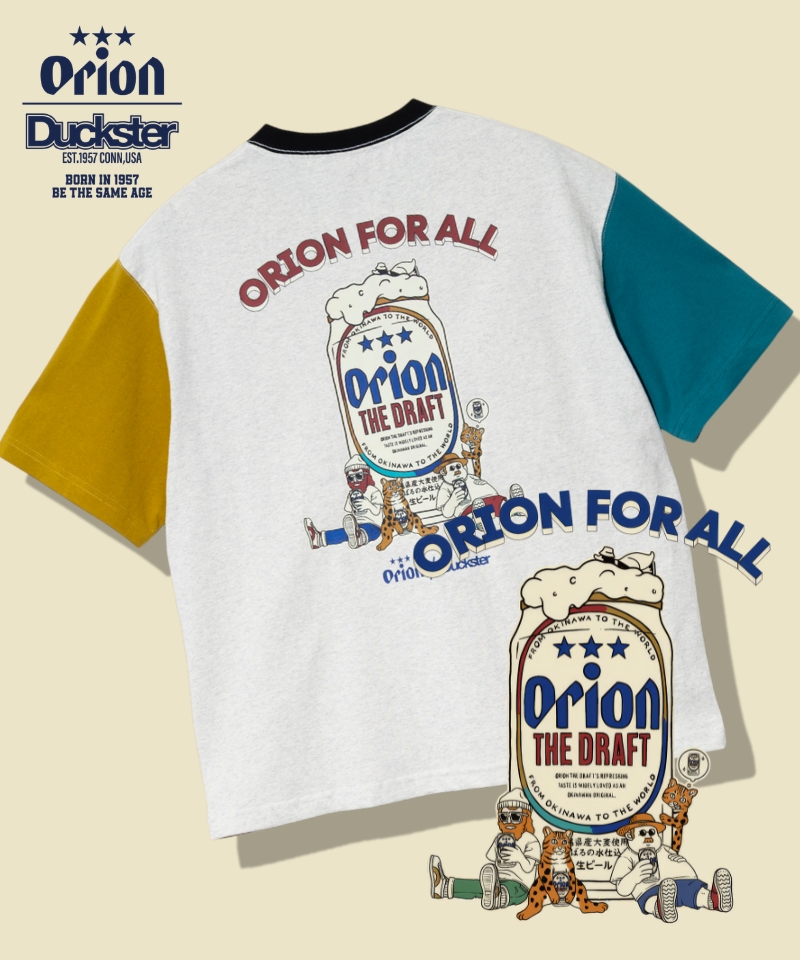 沖縄を代表するビールのブランドで沖縄県民に愛されている【オリオンビール】とアメリカ発祥のアスレチックウェアブランド【Duckster】。共に1957年設立のブランド同士がタッグを組んだグラフィックTシャツ。インパクトと遊び心のあるデザインに仕上がりました。